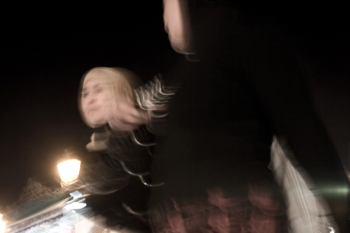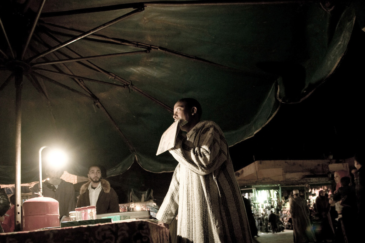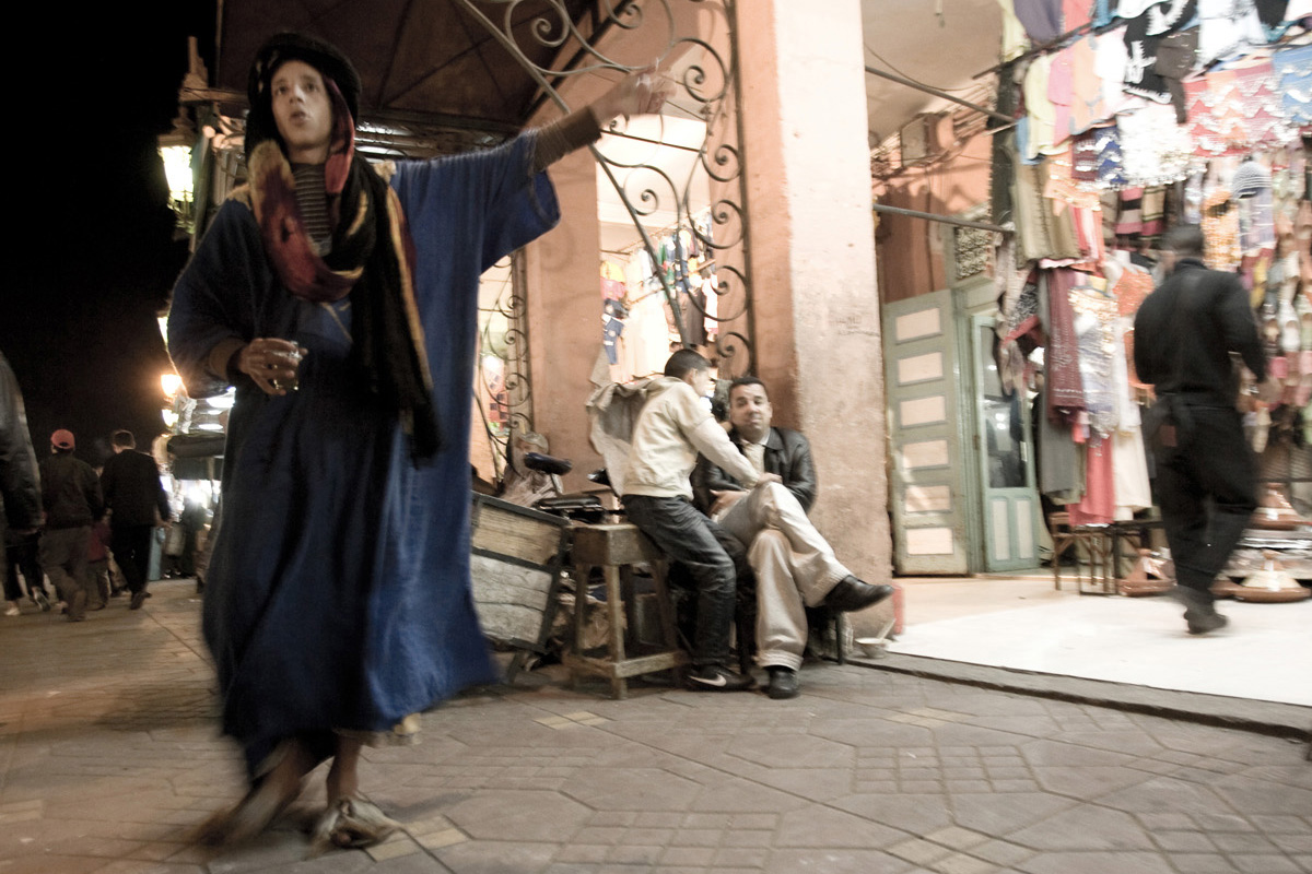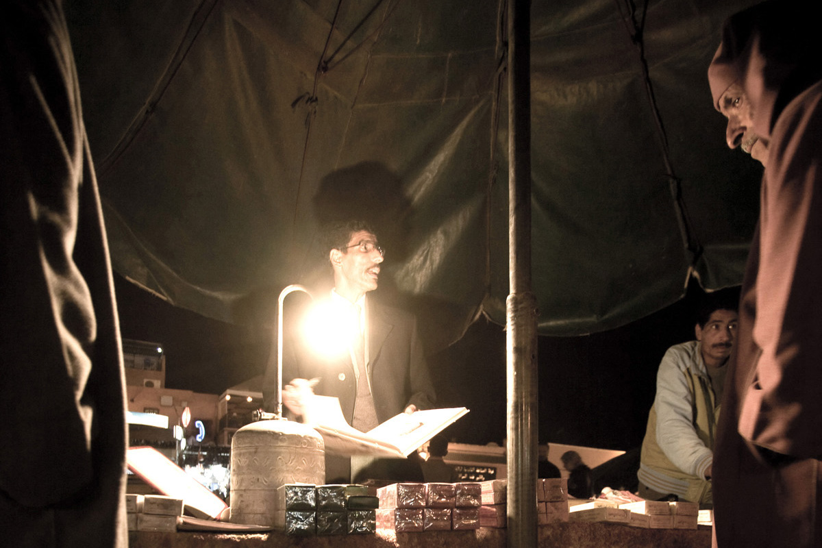 Jemaa el Fna è un palcoscenico che muta la sua scenografia e i suoi attori col trascorrere delle ore. Gli amanti dopo avere sorseggiato l'ennesimo the alla menta e predire il futuro dal vecchio cartomante si confondono tra la folla.