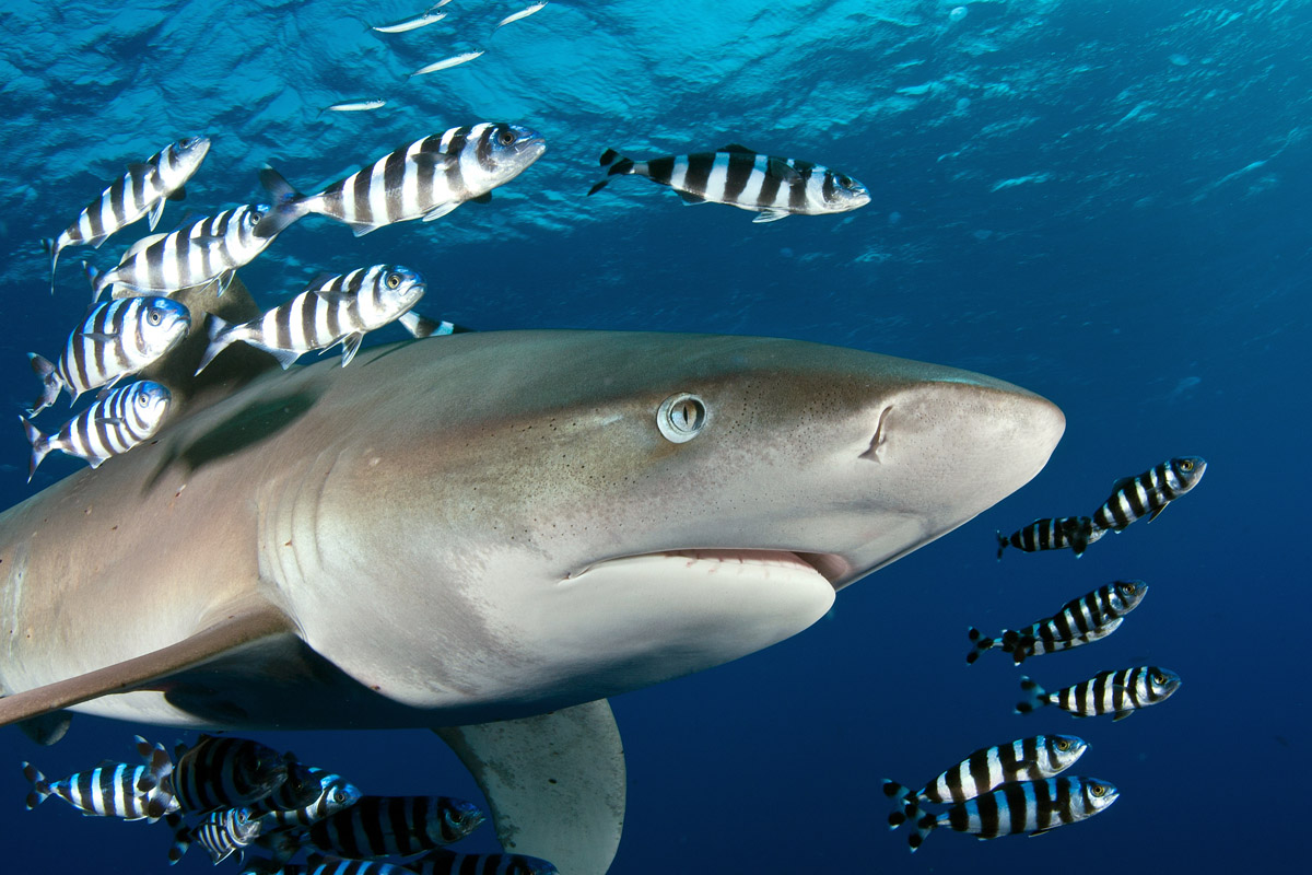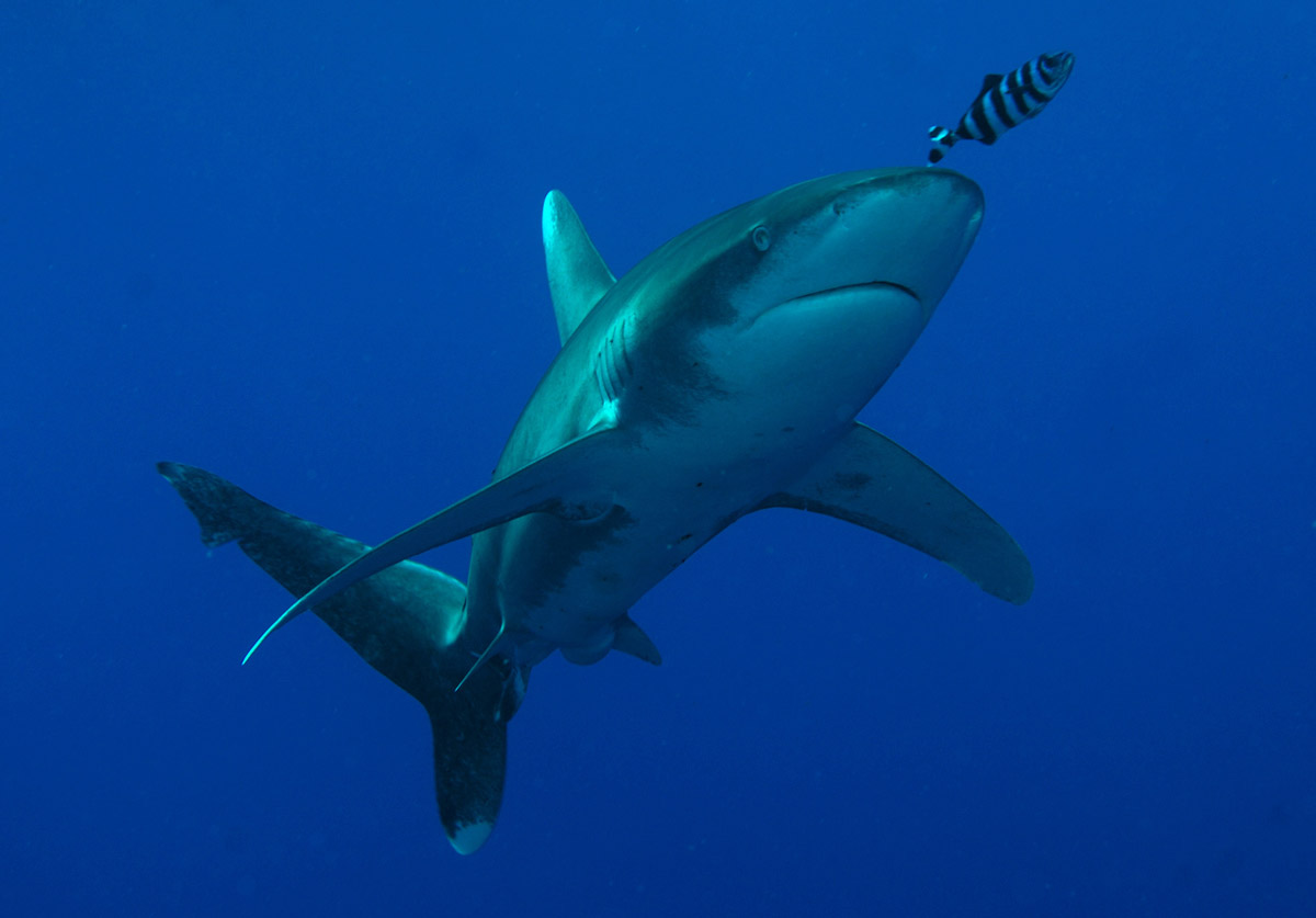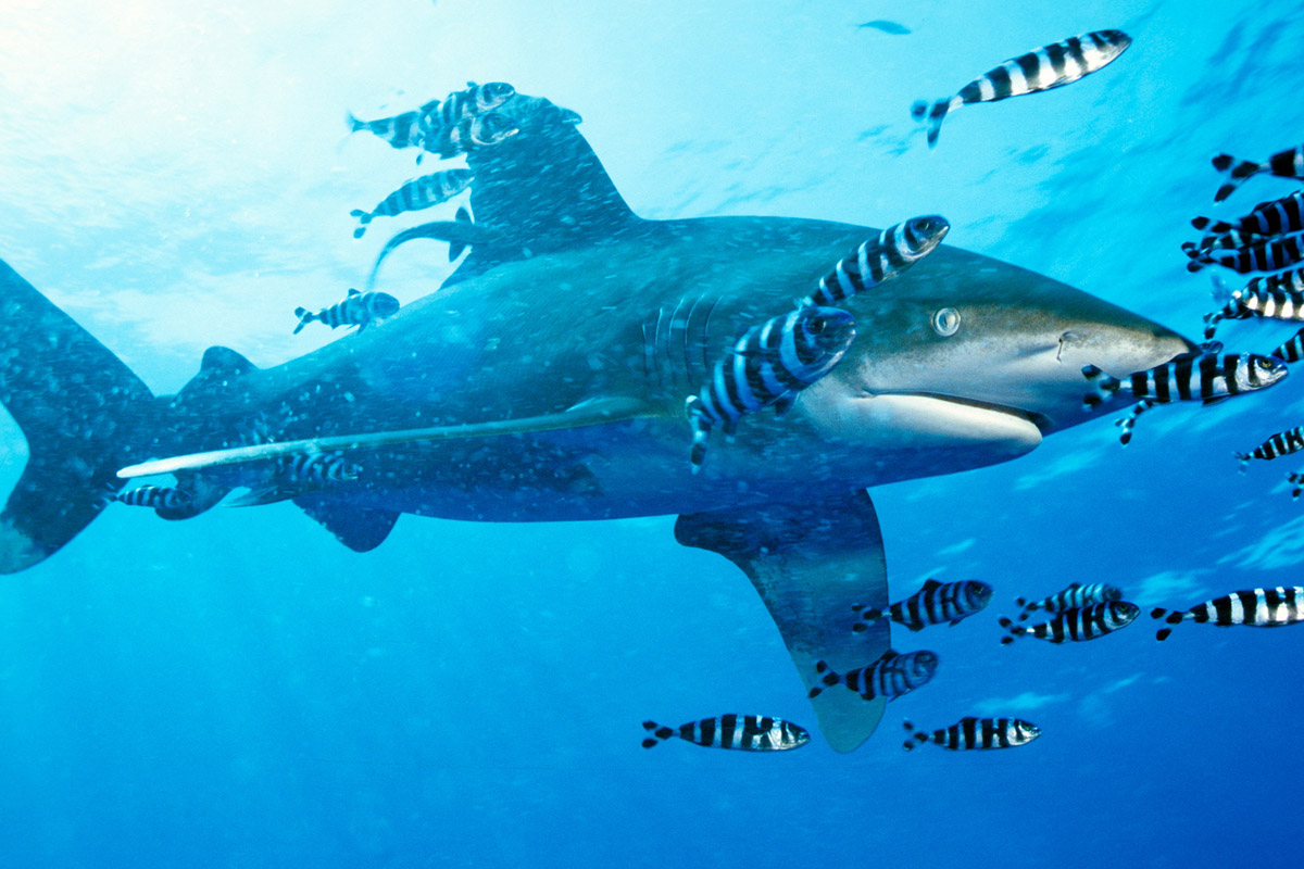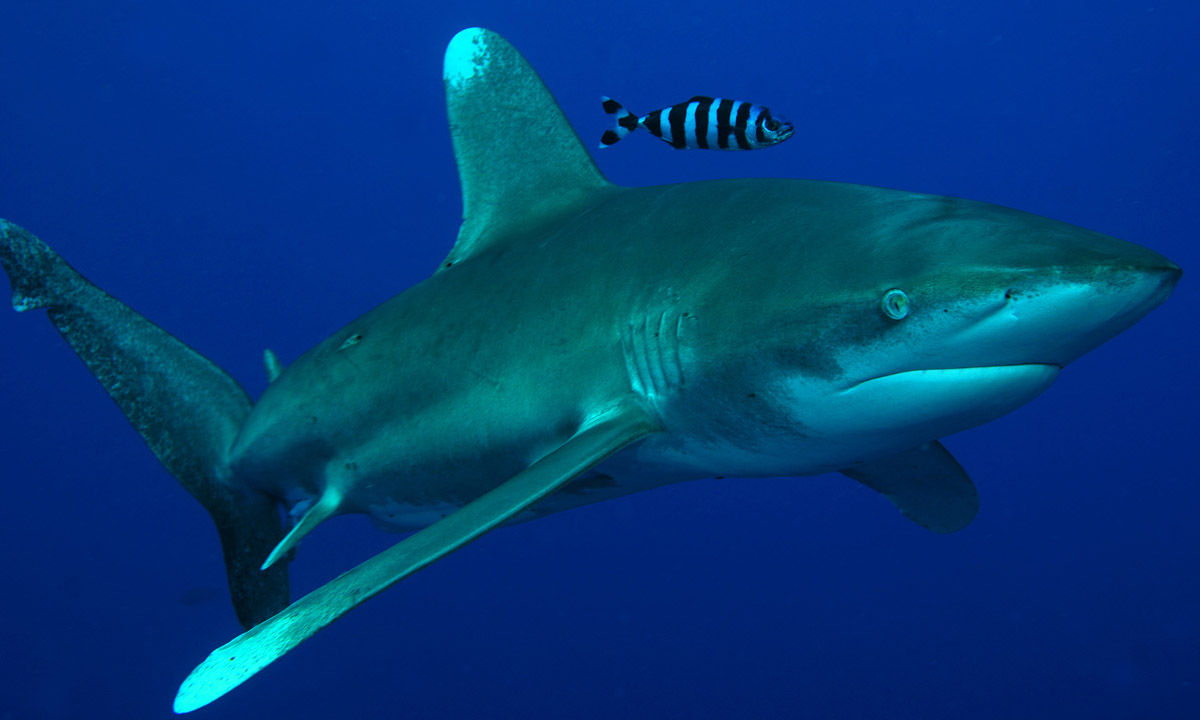 Tipico abitante di mari tropicali e temperati caldi il Carcharhinus longimanus, noto anche come squalo oceanico dalle punte bianche, è un pesce prevalentemente pelagico e per questo viene osservato regolarmente solo lungo i reef posti al largo. Corpo robusto con la tipica forma da Carcarinide, facilmente riconoscibile dalle grandi pinne dorsali e pettorali che presentano pinne molto arrotondate con larga macchia bianca terminale.
