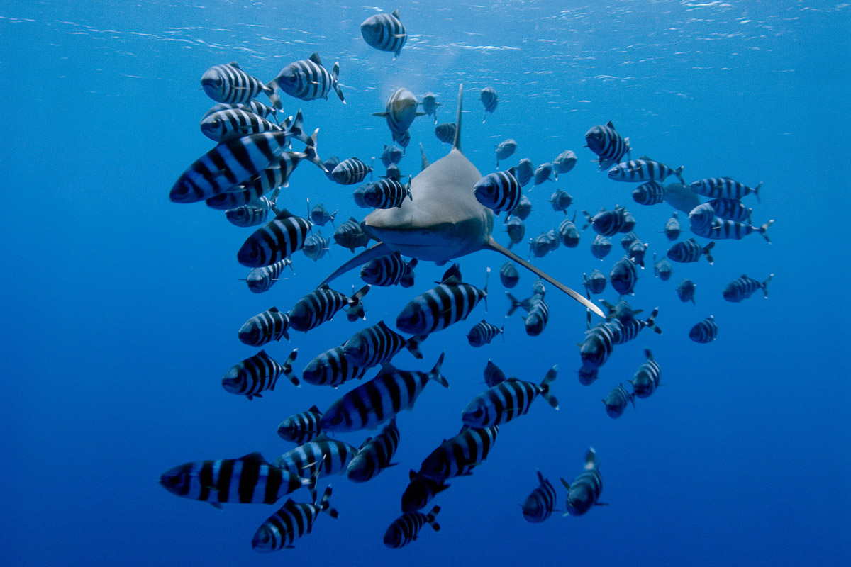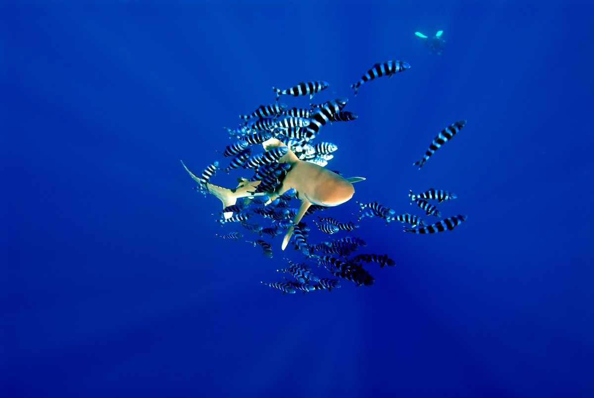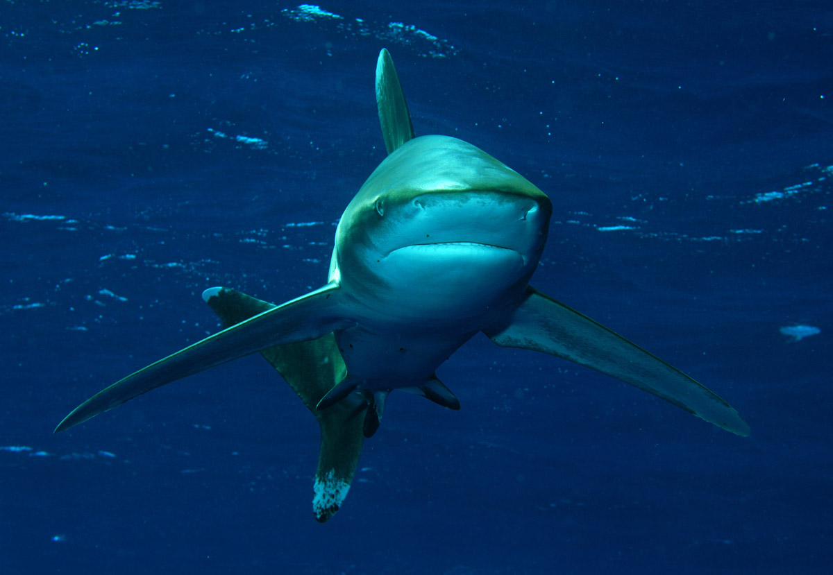 Ripresa in luce ambiente. Come abbiamo detto la situazione più classica è quella di incontrare il longimano in prossimità del reef e quindi della parete. E' bene ricordarsi di non fotografarlo mai con la parete sullo sfondo perchè così facendo l'immagine perderà buona parte della sua qualità infatti, il colore scuro della livrea del pesce andrà inesorabilmente ad impastrarsi con quello della parete di colore simile. Se l'incontro con il pesce avverrà ad una distanza tale per cui la potenza del vostro flash non sarà sufficiente per illuminarlo, fate a meno di usarlo, eviterete così di illuminare l'inevitabile sospensione presente nell'acqua. Con il longimano che si staglia nel blu a debita distanza, prima di scattare osservate attentamente i suoi movimenti. Posizionatevi in modo da riprenderlo ben illuminato dalla luce esterna e quindi con il sole alle vostre spalle; cercate di scattare soltanto quando il pesce avrà assunto una fisionomia non troppo rigida, se no risulterà poco dinamico. Uso del flash. Se avrete la fortuna di trovarvi a distanza tale da poter usare il flash concentratevi bene a mantenete il flash non troppo vicino al soggetto ma al contrario, ad una discreta distanza che vi permetterà di illuminarlo in modo omogeneo, sarà poi la luce esterna a completare l'opera. In questo caso non perdete mai il controllo della distanza tra voi e il pesce. Come sempre la scelta dell'ottica fissa sarà un terno al lotto visto che non possiamo prevedere prima che tipo di incontro ci attende. Considerando le buone possibilità di un incontro relativamente ravvicinato, il consiglio è quello di usare un grandangolo medio. Il problema non si presenterà con una fotocamera dotata di zoom. L'atteggiamento del subacqueo in acqua dovrà essere di attesa evitando di pinneggiare verso di lui ma attendendo la situazione migliore per lo scatto. Ricordatevi sempre che è meglio uno scatto perfetto che tanti scatti mediocri. Respirate con regolarità rimanendo sempre qualche metro sotto la superficie anche nel caso in cui lo squalo dovesse nuotare a pelo d'acqua. Ultimo consiglio non allontanatevi mai troppo dalla scaletta della vostra barca.