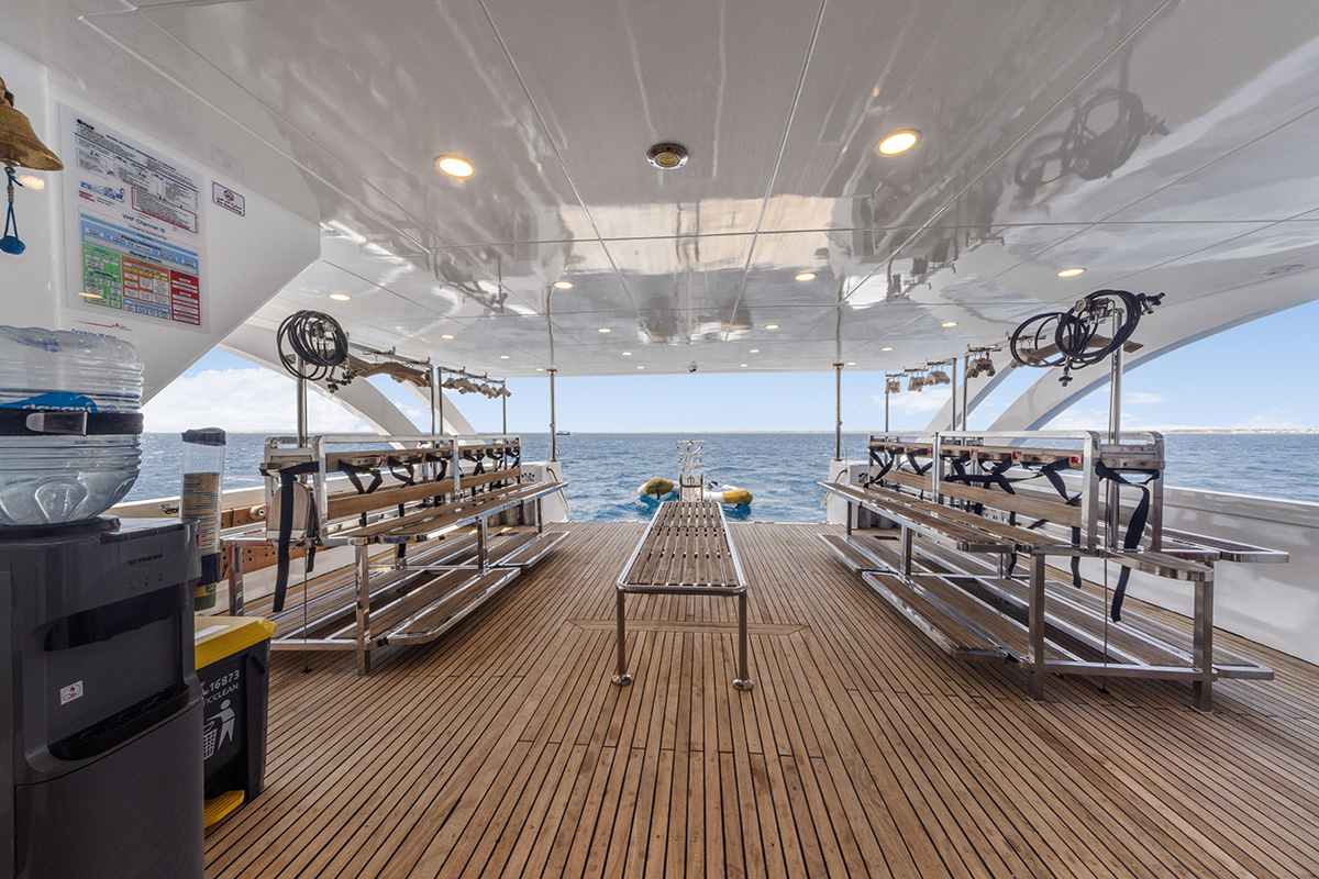 Ponte prncipale piattaforma diving con postazioni personali. Banco ricarica attrezzature fotovideo