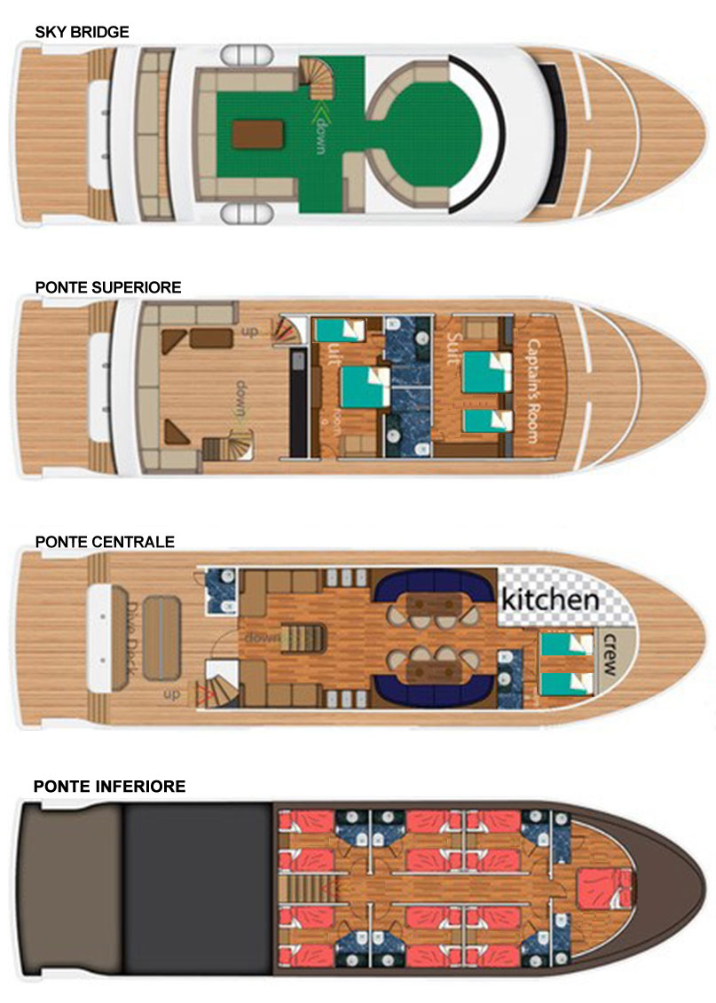 Main Deck piattaforma diving con postazioni personali. Banco ricarica attrezzature fotovideo