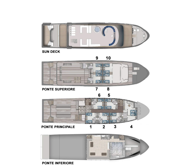 Ponte centrale 5 cabine con letti affiancati, 1 cabina suite con letto matrimoniale