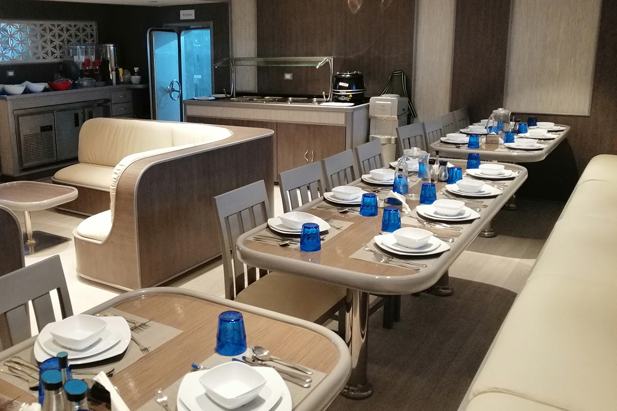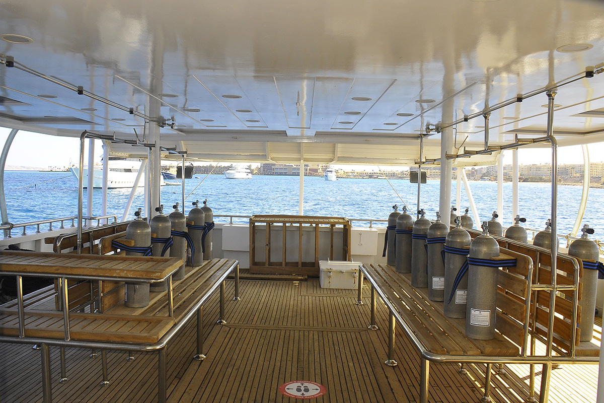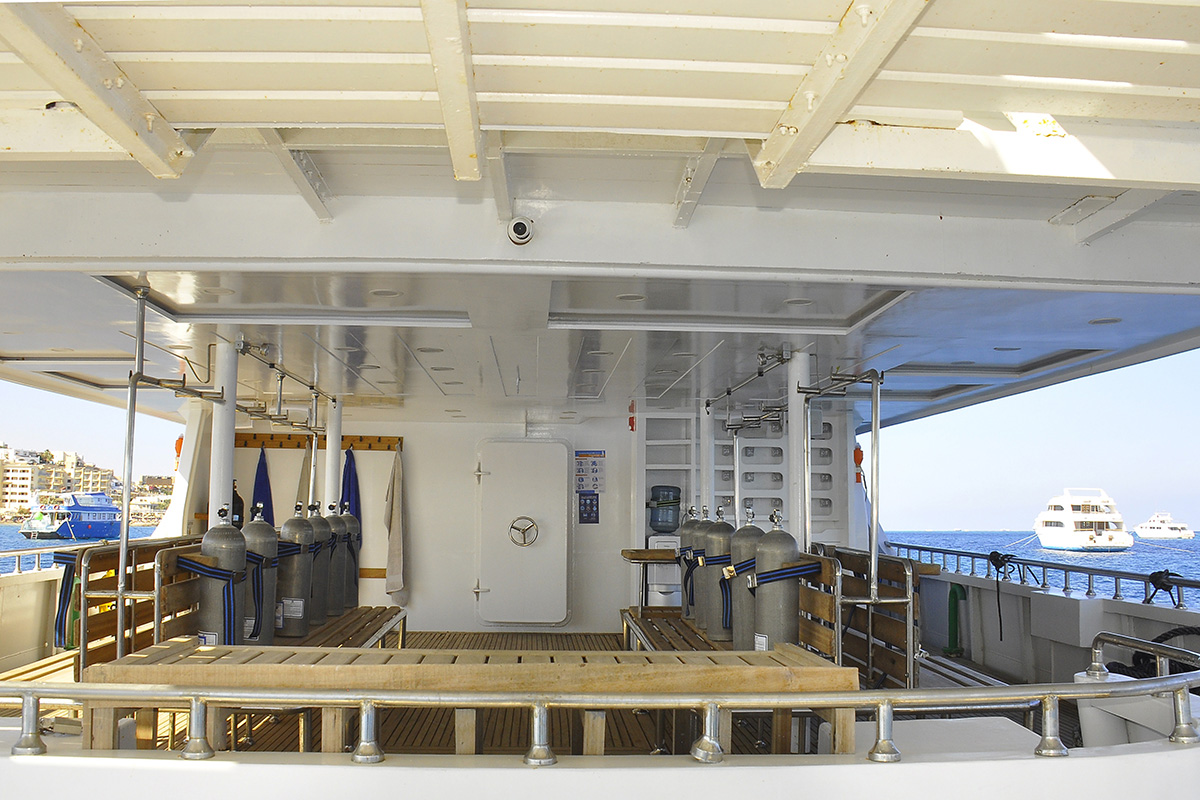Main Deck area diving con postazioni bombole e attrezzatura personale. Banco attrezzature fotovideo, postazioni con prese elettriche per ricariche