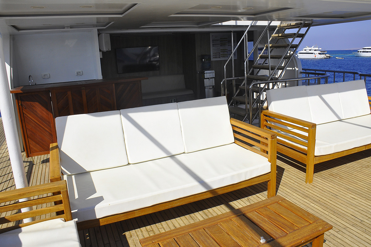 First Deck ponte ombreggiato zona relax con sedute. Bar esterno