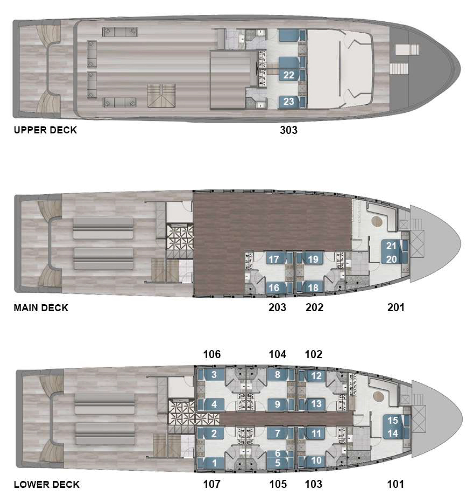 Ponte inferiore 6 cabine con letti affiancati, 1 cabina suite con letto matrimoniale