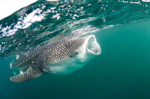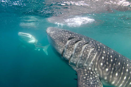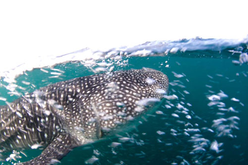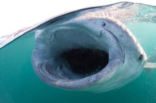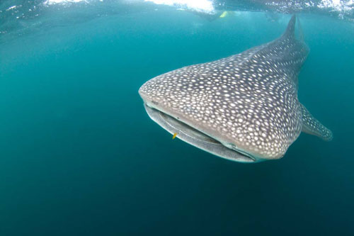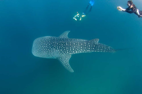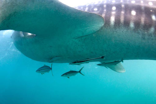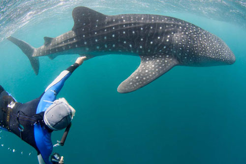 E’ davanti a me, chiaro nelle sue dimensioni di almeno tre metri e limpido nella colorazione della pelle grigia ricoperta da macchie circolari chiare di diverse gradazioni. Mi colpisce la sua eleganza, la morbidezza espressa dai suoi piccoli movimenti, le dimensioni grandi ma rassicuranti. Comincio a nuotare perchè voglio muovermi con lui, temo che qualcosa lo spaventi e sparisca alla mia vista. Invece dimentico delle altrui presenze, inizio a nuotare con calma, quasi ritmicamente ai colpi delle sue pinne. Riesco lentamente a raggiungere la sua enorme testa quadrata, uno strano cuneo di linee morbide ed armoniose, individuo il suo piccolo occhio destro. Lo osservo con attenzione perchè ci hanno detto che quando è pieno, quasi sbarrato, è sintomo che il pesce è tranquillo, ed io voglio fortemente ricambiare questa euforica serenità che l’essergli accanto mi regala.