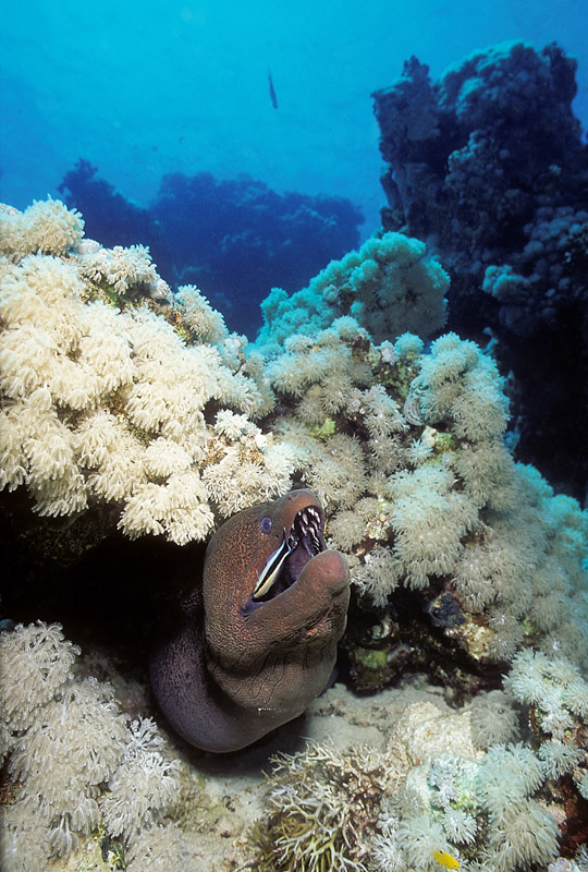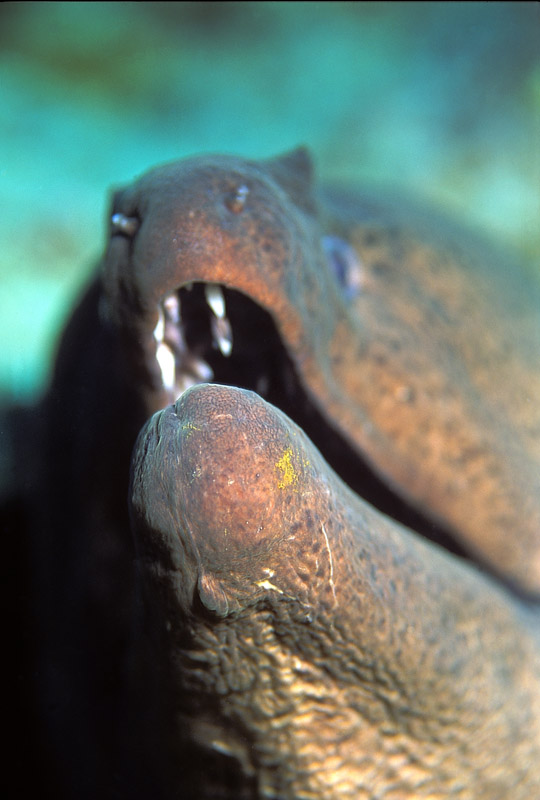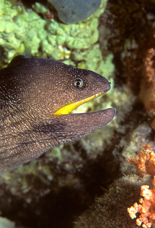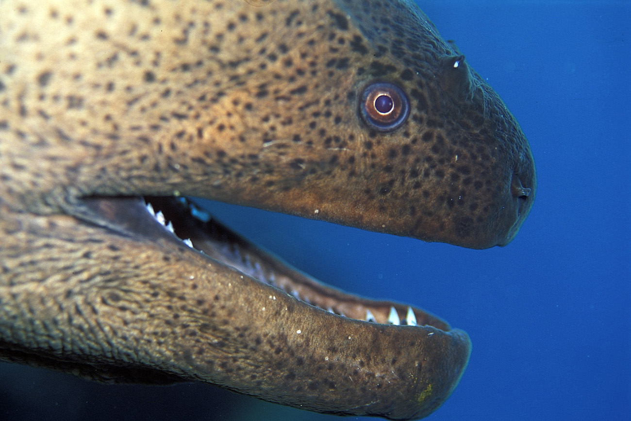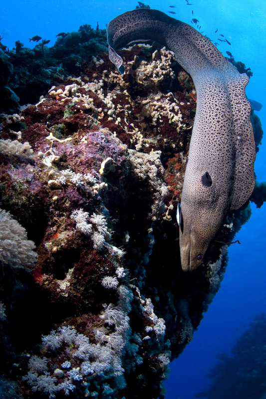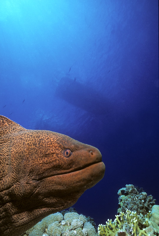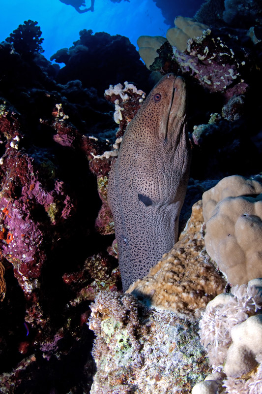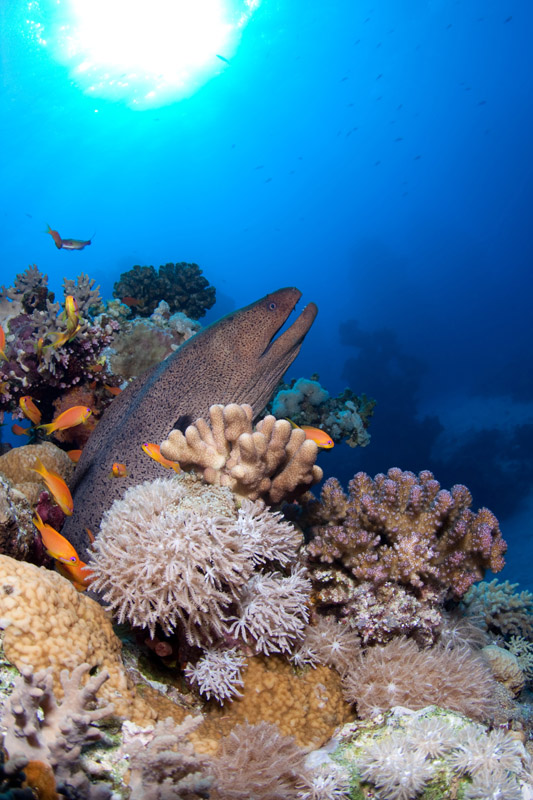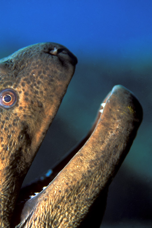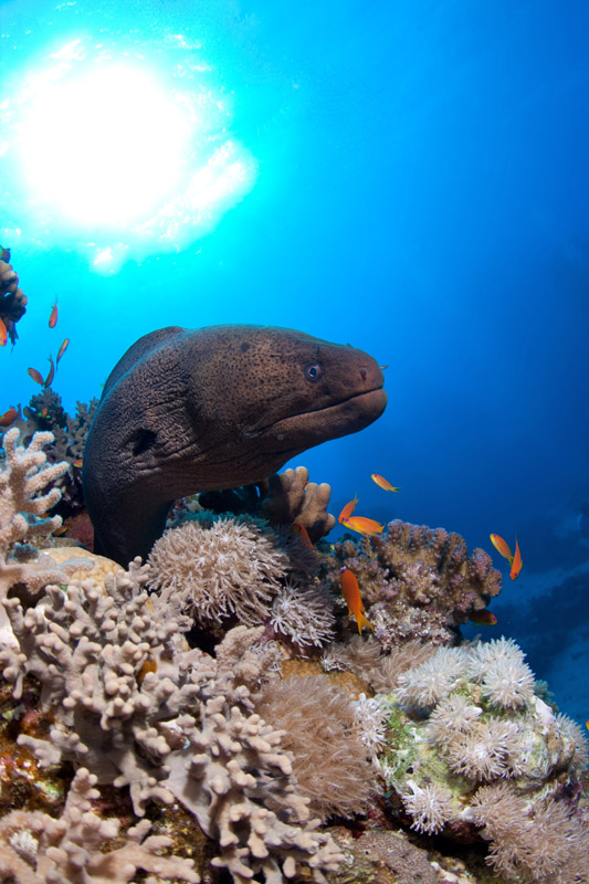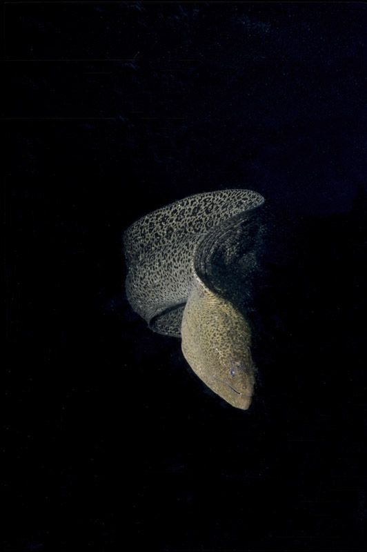La murena non è tra i pesci più semplici da fotografare non certo per motivi legati al suo comportamento quanto per un problema tecnico di assorbimento della luce legato alla sua livrea decisamente scura e opaca. Di contro, aumentando l'intensità del flash rischieremo di sovraesporre tutto ciò che si trova intorno al nostro soggetto. Fatta questa premessa che poi affronteremo nello specifico, possiamo affermare che la murena dal punto di vista comportamentale è relativamente semplice da fotografare. Inoltre il suo comportamento relativamente tranquillo ci permetterà di riprenerla in varie posizioni. La situazione più classica è quella all'interno della sua tana ma con un po' di pazienza la murena potrà essere anche osservata al di fuori mentre si aggira tra gli scogli. Grazie alle molteplici situazioni saranno anche diverse le immagini che potremo realizzare: dalla classica macro allo scatto con il grandangolo. Come sempre l'unico problema per i fotografi che useranno una macchina scafandrata sarà la scelta dell'obiettivo prima di scendere in acqua. Il fatto che la murena ci offra diverse possibilità di ripresa non significa che non si debba prestare attenzione ad una serie di dettagli come ad esempio l'approccio con l'animale che sarà il segreto per realizzare una buona immagine. La murena è animale abbastanza timido che in certe situazioni può diventare anche aggressivo. Come tutti gli animali è anche curioso e sarà proprio questa sua curiosità a farla uscire dalla sua tana. MACRO per realizzare una corretta macro del pesce dovremo riprenderla quando avrà estratto il suo muso fuori dalla tana, quando sarà tranquilla e soprattutto curiosa di osservare cosa sta accadendo intorno a lei. Per fare in modo che tutto ciò avvenga, il fotografo dovrà essersi fatto accettare dall'animale, avere pazienza che questo dopo essersi rintanato una o più volte, decida che è arrivato il momento di uscire a prendere confidenza con il subacqueo. Soltanto allora, dopo essersi preventivamente posizionati, attenderemo che il pesce si allunghi verso di noi mostrandoci il suo meraviglioso muso. Cercando di evitare qualsiasi movimento inadeguato, inizieremo a scattare posizionando il flash nel modo più corretto. Come abbiamo detto e ripetuto più volte, dopo un primo scatto di prova, verificheremo i corretti parametri della nostra macchina. Se è tutto a posto potremo iniziare a scattare cercando di controllare sempre la messa a fuoco e le forti ombre che spesso si formano intorno al soggetto. GRANDANGOLO grazie al nostro obiettivo saremo in grado di contestualizzare il soggetto nell'ambiente circostante. In questo caso sarà ancora più importante definire prima il nostro set di ripresa. Posizionarsi trovando il migliore assetto che ci permetta di lavorare tranquillamente e attendere l'uscita della murena che diventerà finalmente l'attore principale. A quel punto saremo noi a scegliere la migliore inquadratura e a posizionare i flash correttamente. Il problema dell'assorbimento della luce sulla sua livrea, verrà risolto non aumentando l'intensità di luce del flash ma trovando la corretta distanza dei flash rispetto al soggetto. Non dimentichiamoci che intorno a noi ci sarà un ambiente che dovrà anch'esso essere illuminato correttamente.