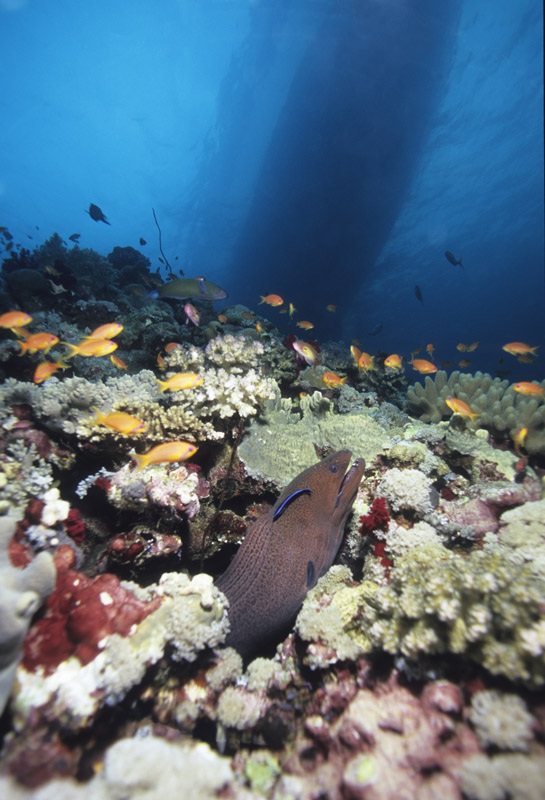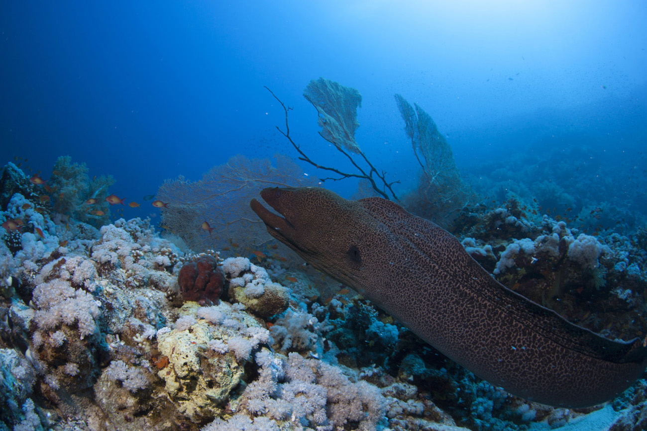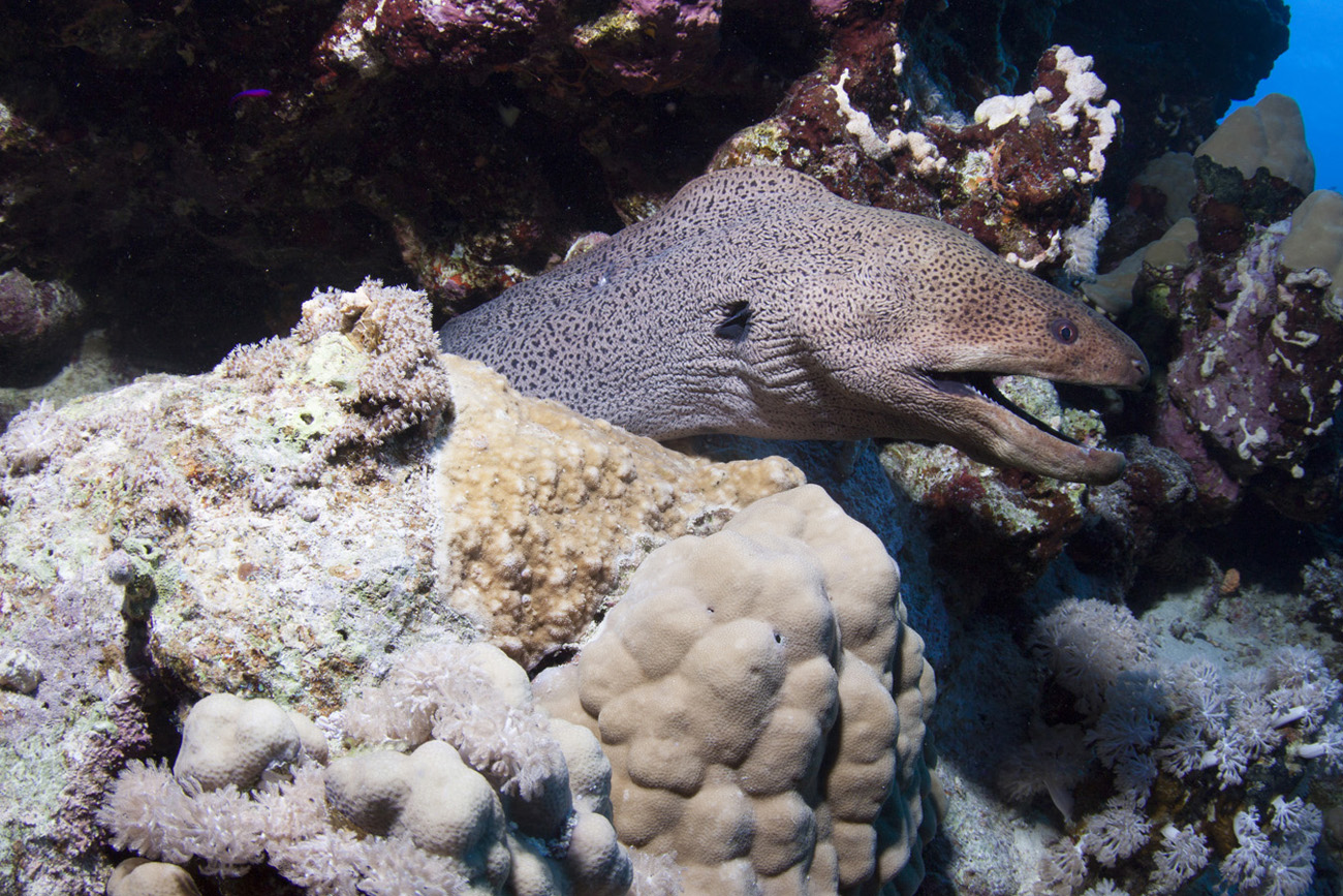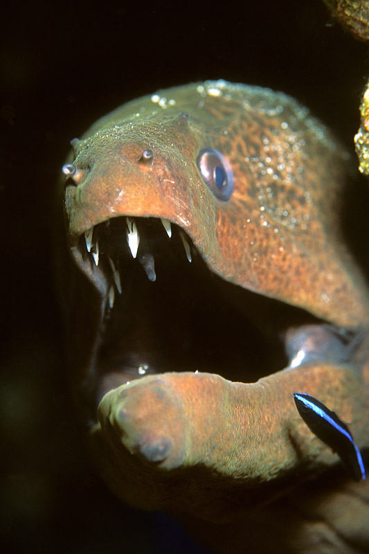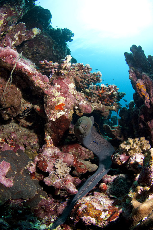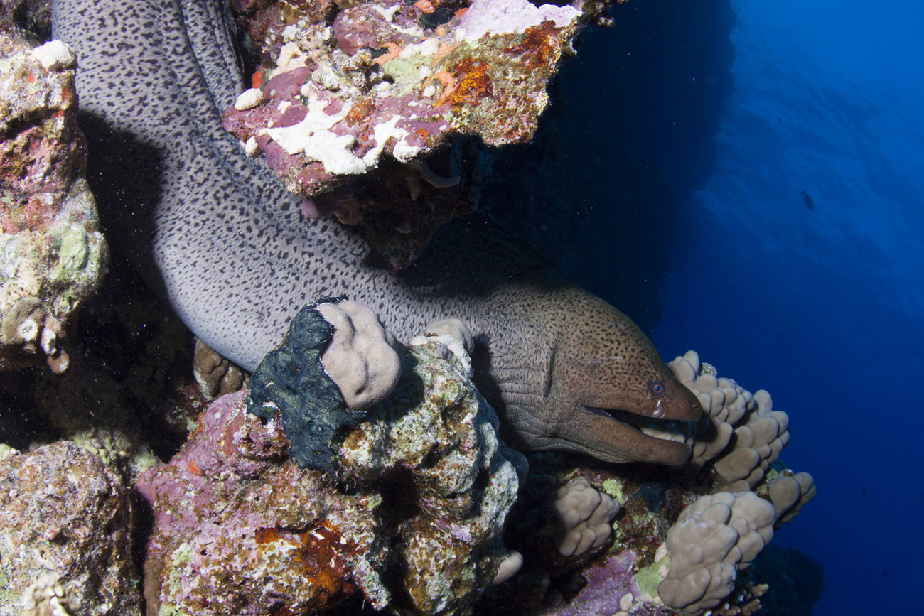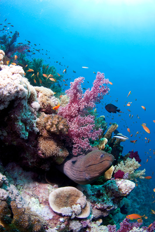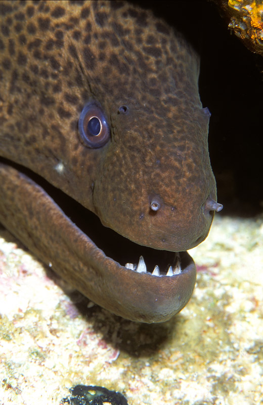 La murena non è tra i pesci più semplici da fotografare non certo per motivi legati al suo comportamento quanto per un problema tecnico di assorbimento della luce legato alla sua livrea decisamente scura e opaca. Di contro, aumentando l'intensità del flash rischieremo di sovraesporre tutto ciò che si trova intorno al nostro soggetto. Fatta questa premessa che poi affronteremo nello specifico, possiamo affermare che la murena dal punto di vista comportamentale è relativamente semplice da fotografare. Inoltre il suo comportamento relativamente tranquillo ci permetterà di riprenerla in varie posizioni. La situazione più classica è quella all'interno della sua tana ma con un po' di pazienza la murena potrà essere anche osservata al di fuori mentre si aggira tra gli scogli. Grazie alle molteplici situazioni saranno anche diverse le immagini che potremo realizzare: dalla classica macro allo scatto con il grandangolo. Come sempre l'unico problema per i fotografi che useranno una macchina scafandrata sarà la scelta dell'obiettivo prima di scendere in acqua. Il fatto che la murena ci offra diverse possibilità di ripresa non significa che non si debba prestare attenzione ad una serie di dettagli come ad esempio l'approccio con l'animale che sarà il segreto per realizzare una buona immagine. La murena è animale abbastanza timido che in certe situazioni può diventare anche aggressivo. Come tutti gli animali è anche curioso e sarà proprio questa sua curiosità a farla uscire dalla sua tana. MACRO per realizzare una corretta macro del pesce dovremo riprenderla quando avrà estratto il suo muso fuori dalla tana, quando sarà tranquilla e soprattutto curiosa di osservare cosa sta accadendo intorno a lei. Per fare in modo che tutto ciò avvenga, il fotografo dovrà essersi fatto accettare dall'animale, avere pazienza che questo dopo essersi rintanato una o più volte, decida che è arrivato il momento di uscire a prendere confidenza con il subacqueo. Soltanto allora, dopo essersi preventivamente posizionati, attenderemo che il pesce si allunghi verso di noi mostrandoci il suo meraviglioso muso. Cercando di evitare qualsiasi movimento inadeguato, inizieremo a scattare posizionando il flash nel modo più corretto. Come abbiamo detto e ripetuto più volte, dopo un primo scatto di prova, verificheremo i corretti parametri della nostra macchina. Se è tutto a posto potremo iniziare a scattare cercando di controllare sempre la messa a fuoco e le forti ombre che spesso si formano intorno al soggetto. GRANDANGOLO grazie al nostro obiettivo saremo in grado di contestualizzare il soggetto nell'ambiente circostante. In questo caso sarà ancora più importante definire prima il nostro set di ripresa. Posizionarsi trovando il migliore assetto che ci permetta di lavorare tranquillamente e attendere l'uscita della murena che diventerà finalmente l'attore principale. A quel punto saremo noi a scegliere la migliore inquadratura e a posizionare i flash correttamente. Il problema dell'assorbimento della luce sulla sua livrea, verrà risolto non aumentando l'intensità di luce del flash ma trovando la corretta distanza dei flash rispetto al soggetto. Non dimentichiamoci che intorno a noi ci sarà un ambiente che dovrà anch'esso essere illuminato correttamente.