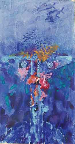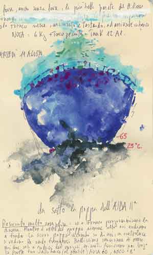 La seconda si chiama “L’Arco”. Ci andiamo in tre (io, Franco e il terrore degli squali Sergio). L’Aldebaran si è spostato a Sud e galleggia su di un mare di cristallo. Seguiamo il pianoro fino a che una luce diversa dal fondo ci segnala il punto. Giù rapidi alla parà: -30, 40, 50 metri. Davanti a noi si apre l’enorme caverna passante. Sfioriamo il “sarcofago” e, uscendo dall’altro lato, le bianche fiorite fruste ci invitano a restare ancora un poco. Situazione : - 63 m., deco 16’, aria 70 bar. E’ tempo. Rapidi fino a mezza quota, sosta. Mi volto e, dal fondo, Poseidone con cocchio, cavalli marini agita il tridente e ci saluta. Le sirene, intorno, mostrano sorridenti e maliziose i piccoli seni.