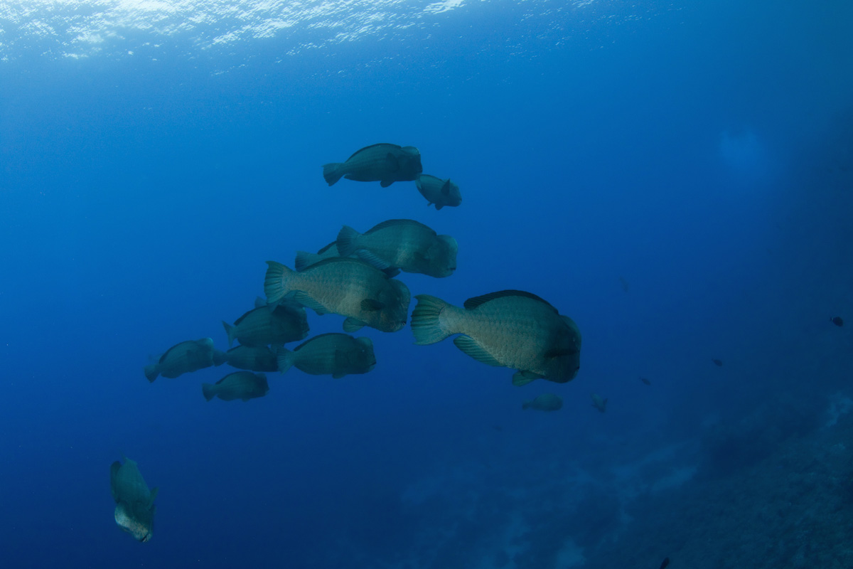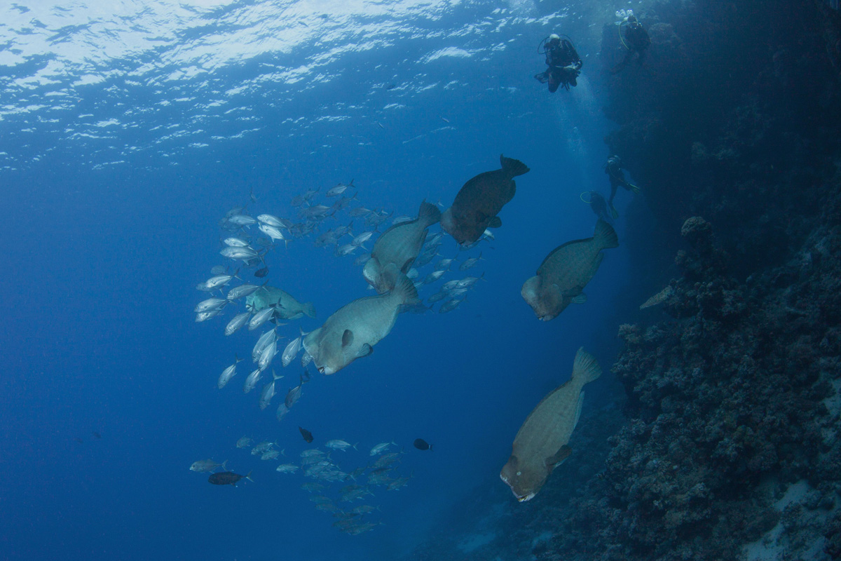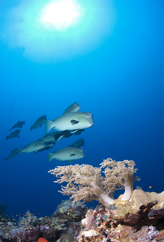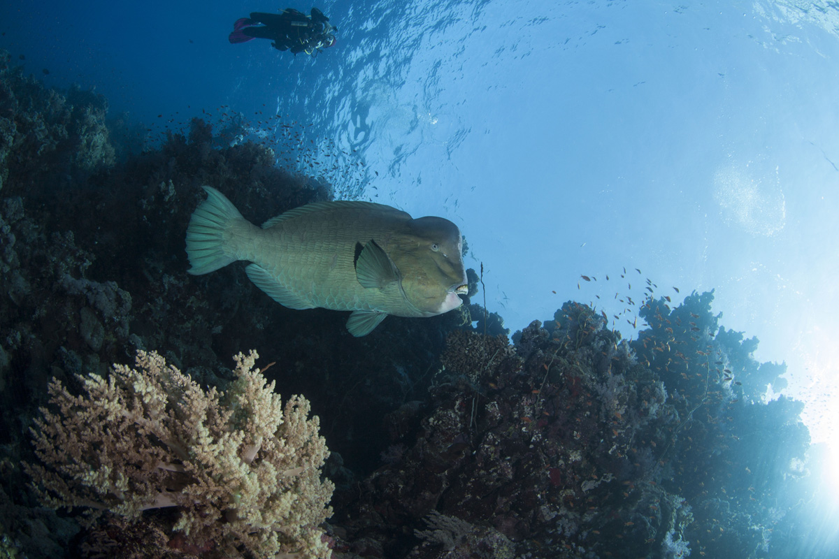 Il curioso pappagallo rinoceronte, non è il massimo della bellezza dal punto di vista estetico disponendo di una sagoma compatta e poco armoniosa soprattutto se osservato su un fianco. La situazione cambia il momento in cui ci si imbatte nel branco che nuota nel blu oppure mentre "pascolano" compatti sulla piattaforma del reef. Dal punto di vista tecnico la differenza tra incontrarli nel blu, o pochi centimetri sotto il pelo dell'acqua, sta nel diverso assorbimento della luce proveniente dall'esterno suula livrea del pesce.