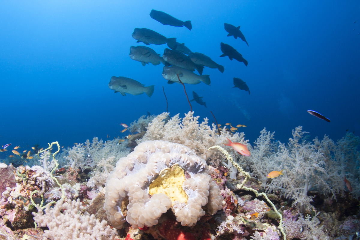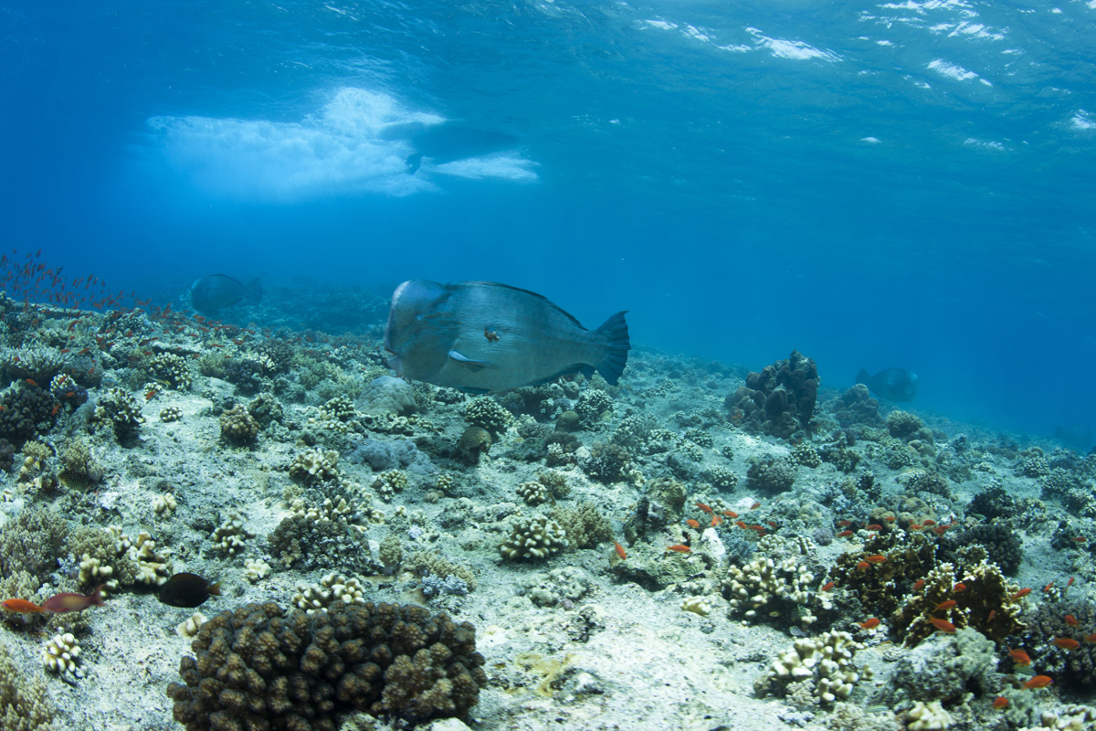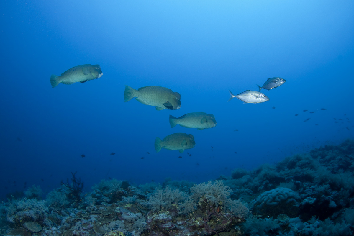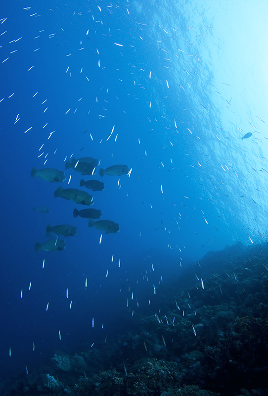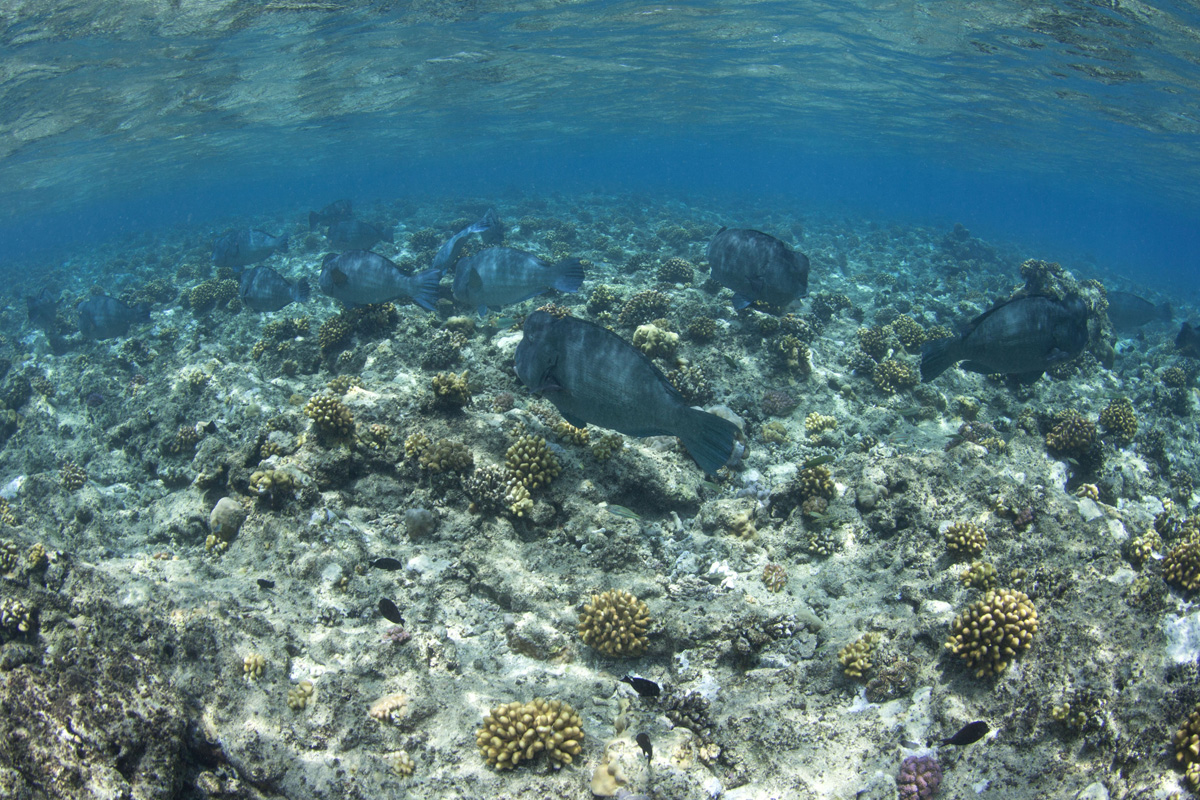 Il curioso pappagallo rinoceronte, non è il massimo della bellezza dal punto di vista estetico disponendo di una sagoma compatta e poco armoniosa soprattutto se osservato su un fianco. La situazione cambia il momento in cui ci si imbatte nel branco che nuota nel blu oppure mentre "pascolano" compatti sulla piattaforma del reef. Dal punto di vista tecnico la differenza tra incontrarli nel blu, o pochi centimetri sotto il pelo dell'acqua, sta nel diverso assorbimento della luce proveniente dall'esterno suula livrea del pesce.
