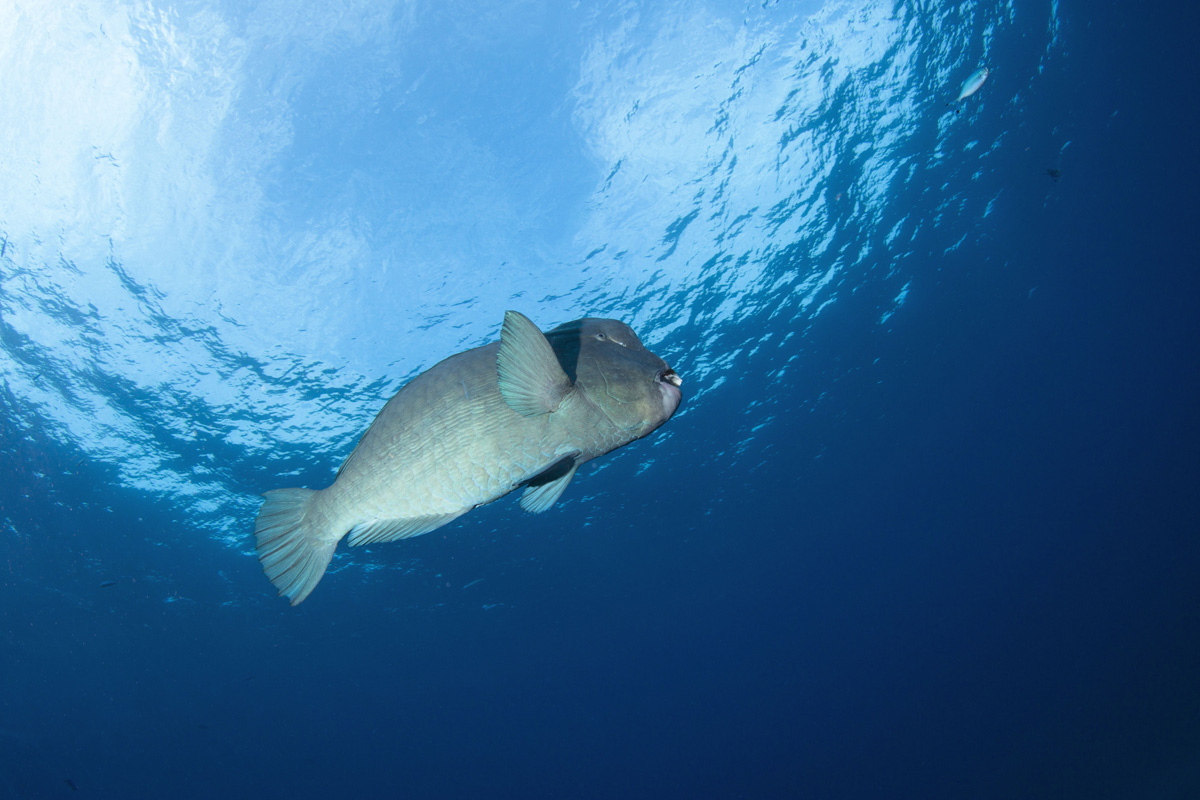Pesce appartenente a una famiglia molto presente e riconoscibile sui reef, quella degli Scaridae o pesci pappagallo. Il Bolbometopon muricatum è sicuramente uno dei rappresentanti più impressionanti con i suoi 50 kg di peso per quasi un metro e mezzo di lunghezza. Profilo molto alto tra dorso e ventre, grigio opaco nella livrea giovanile, verde cupo da adulto col corpo ricoperto di grosse e vistose scaglie. Caratterizzato da una grossa protuberanza che cresce man mano che l'individuo diventa adulto.