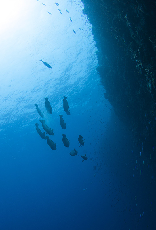 Nel primo caso se la fortuna ci assiste, potremo incontrarli nella fascia tra i 5 e 10 metri laddove la luce esterna riesce a penetrare sufficientemente in modo da darci la possibilità di sfruttarla sia per il controluce sia come schiarita. Sarà spesso necessario un colpo di flash dato che la livrea ha un assorbimento notevole ma nel caso in cui non ci si trovi abbastanza vicino, si potrà tranquillamente scattare sfruttando la sola luce esterna. Nel caso invece di un incontro sulla parte superiore del reef e quindi pochi centimentri sotto la superficie, qui la luce proveniente dall'esterno sarà sufficiente ad illuminare il vostri soggetti senza fare uso del flash. In questo caso sarà necessario usare un tempo abbastanza veloce per evitare di realizzare una immagine mossa. Come sempre le ore migliori sono quelle in cui la luce illumina trasversalmente (mattino o pomeriggio) e non nelle ore contrali con la luce a picco. Il vero trucco per realizzare una immagine ben composta sarà quello di riuscire ad avvicinarsi il più possibile ai soggetti senza che questi si spaventino. Per questo bisogna avere un po' di pazienza e accostarsi con molta calma senza disturbare. Sicuramente l'uso di un buon grandangolo vi permetterà di realizzare immagini interessanti.