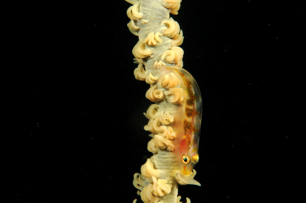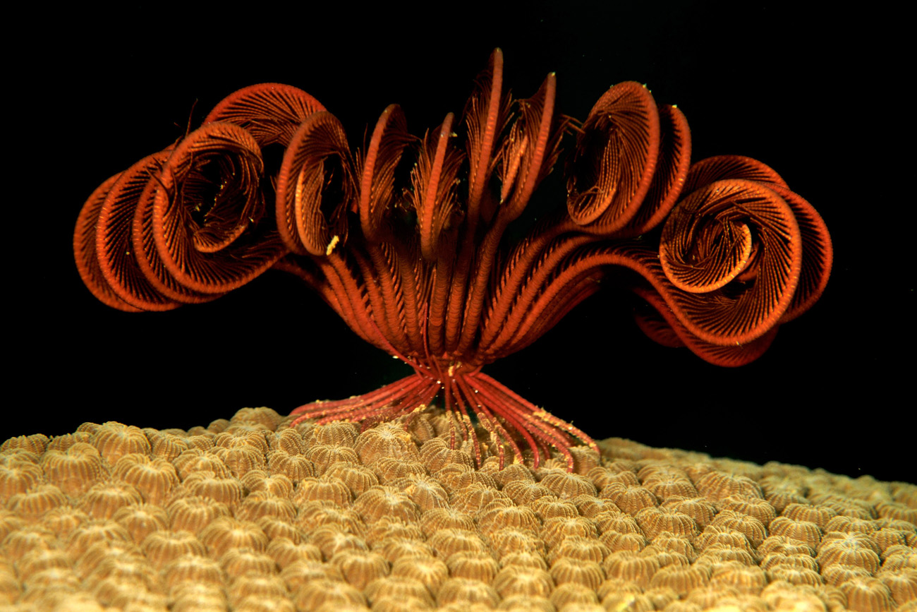 Pochi metri più avanti, dalla sabbia fa capolino il muso di un’anguilla serpente, che sembra indicarci la strada verso un crinoide intento a cibarsi, come le migliaia di crinoidi che incontriamo in queste immersioni.