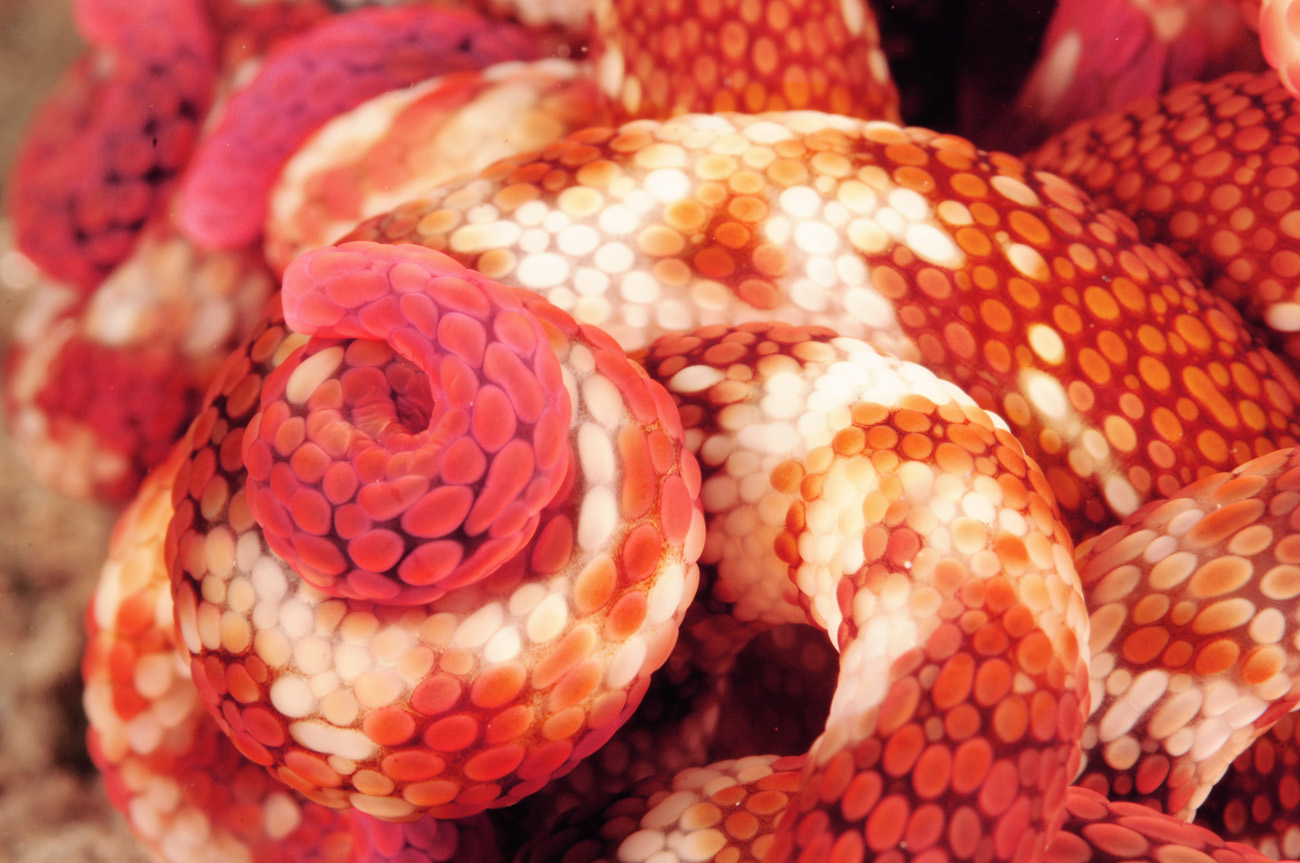 Anche questa immersione volge al termine, e quando ci troviamo a non più di tre metri di profondità, proprio sotto il bar galleggiante dove sulla sabbia una miriade di stelle compongono originalissime costellazioni, non riusciamo a decidere se soffermarci su un serpente di mare dalla rispettabile stazza, oppure non perdere di vista una coppia di draghi di mare che goffamente “zampettano” sul fondo in cerca di riparo. La stessa identica immersione la facciamo anche in notturna, uscendo tra le luci delle stelle e le luci della baia, con sorrisi e risate che manifestano lo stato di grazia ed euforia che ci resta dopo una delle notturne a più alto tasso di incontri, in cui biologia e fantasia sono separate solo dalla nostra formazione scientifica. Cavallucci marini pigmei, rinomurene, scorfani foglia, un picnogonide; sono altri “Incontri ravvicinati del terzo tipo”che hanno reso questo viaggio così ricco di novità.