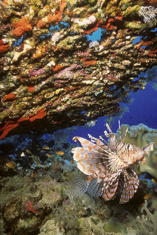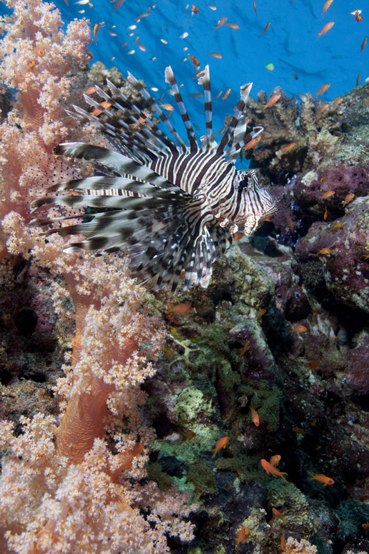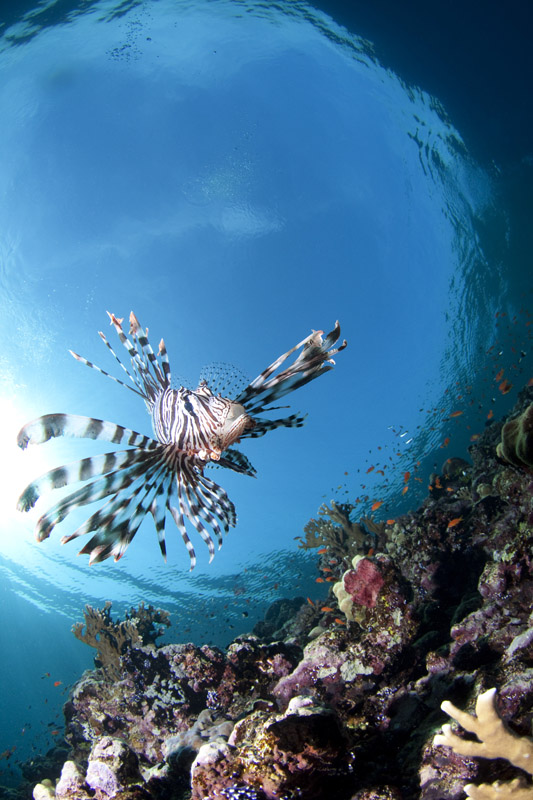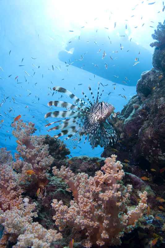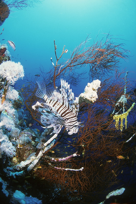Il pesce leone o Pterois Volitans appartiene a quella categoria privilegiata di pesci che hanno tutte le caratteristiche per poter essere fotografati in qualsiasi situazione, ottenendo quasi sempre un ottimo risultato grazie alla sua splendida forma e al fatto che non fugge, anzi il più delle volte si mette anche in posa permettendoci di dedicare tutto il tempo per organizzare al meglio il nostro set di ripresa. Considerate queste situazioni privilegiate, possiamo allora concentrarci sull'inquadratura. Per chi dispone di una compatta non sussisterà il problema nella scelta dell'obiettivo potendo utilizzare indifferentemente la funzione macro per realizzare i primi piani o addirittura i dettagli del pesce e in alternativa il grandangolo per una ripresa di ambiente. Chi invece lavorerà con la custodia avrà deciso a priori quale lente montare e quindi che tipo di immagini realizzare. L'unico problema che può creare lo Pterois è che molto spesso, quando si sente oppresso, tende a girarsi mostrando la parte posteriore del suo corpo. Sicuramente non la più fotogenica da riprendere. Sarà allora necessario rimanere in attesa che il pesce si giri di nuovo mostrando il meglio di se'. OBIETTIVO MACRO grazie all'assoluta immobilità del pesce quando si trova adagiato su un corallo o all'interno di un anfratto, avremo la possibilità di avvicinarci quanto desideriamo potendo quindi realizzare anche immagini macro molto spinte fino a riprenderne i dettagli più minuti. Sarà necessario in questo caso trovare il miglior assetto facendo attenzione a non appoggiarci a coralli o quant'altro. Fate attenzione a direzionare il flash in modo che non crei forti ombre intorno al soggetto. Per evitare questo problema il flash dovrà essere tenuto all'altezza della custodia e direzionato sul soggetto cercando di evitare le ombre.OBIETTIVO GRANDANGOLARE sono diverse le situazioni che ci verranno proposte dal soggetto. Molto spesso il pesce nuota in solitario ma capiterà anche di incontrarlo accoppiato ad altri esemplari. Lo incontreremo appoggiato su una gorgonia o sotto una bella acropora, mentre fluttua solitario nel blu o vicino ad un alcionaria colorata. Insomma situazioni davvero ideali. E' proprio questo il momento in cui bisogna dedicare qualche minuto per decidere quale sarà la migliore situazione scenografica. Attendete che il soggetto si posizioni nel migliore dei modi e poi scattate. Se disponete di flash separato dal corpo macchina, non dimenticatevi di sfruttare la luce esterna come fonte luminosa principale, sarà sufficiente un leggero colpo di flash come schiarita per realizzare una ottima immagine.
