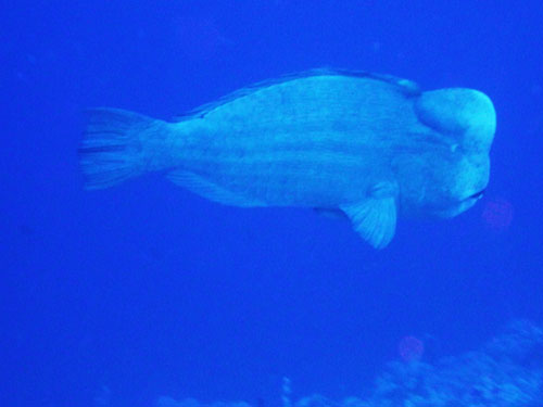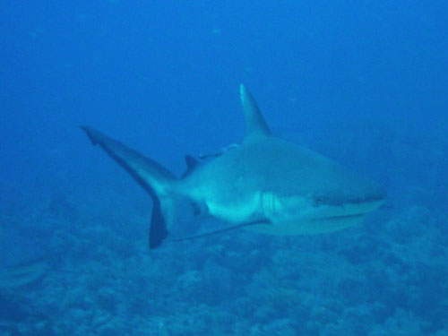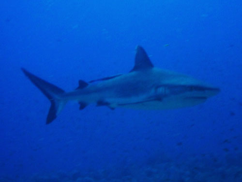 Alle 7:30 sveglia e alle 8:00 dopo un Breafing dettagliato di Massimo ci si tuffa e si inizia l’avventura. Nella discesa guardando in alto si avvistano 2 pappagalli buffalo o rinoceronte molto grandi e buffi e il primo squalo grigio… questa sarà per me e anche per Flavio una delle immersioni che più ci hanno regalato emozioni e voglia di vivere. La nostra prima immersione con gli squali!!!! Appena immersi si scende e si punta verso il blu. Subito si incontrano i primi squali grigi e pinna bianca… io e Flavio riusciamo a vederli da lontano perché siamo gli ultimi della fila ma presto saremo ricompensati! Mentre gli altri risalgono seguendo le guide noi due prima di seguirli veniamo raggiunti sul pianoro a circa 28 metri dagli stessi squali che gli altri vedevano a 50 metri. Anche Giovanni è con noi, ci fa segno di fermarci dietro piccoli blocchi di corallo e di non spaventarli, girano a pochi metri da noi: sono tre squali grigi, due anche di grossa taglia, ci scrutano ed io già li amo, si perché io adoro gli squali ma mai avrei pensato di condividere un momento della mia vita con loro in questo modo. Flavio anche lui molto felice li fotografa e queste saranno le uniche foto belle riuscite agli squali con la nostra macchina fotografica dato che poi li avvisteremo ma a profondità maggiori e non consentite allo scatto per la nostra fotocamera che farà anche miracoli scattando a 47 metri! Si termina l’immersione non prima di aver ammirato la parete ricca di coralli di mille colori, pesci farfalla, gruppi di fucilieri, pesci pappagallo, pesci chirurgo e pesci farfalla…notiamo anche 2 pesci falco oltre che 2 grossi barracuda e altri 2 Napoleone cosa si vuole di più dalla vita?