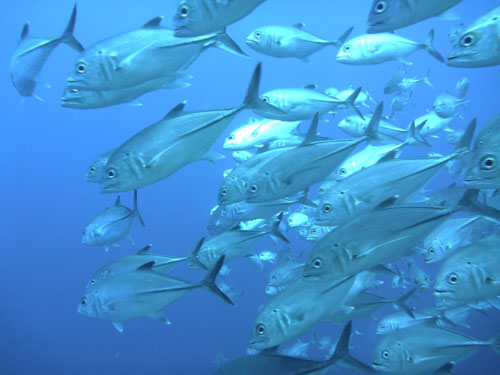 A Merlo reef punta Sud, immersione del pomeriggio, facciamo un bellissimo incontro con un gruppo di carangidi, circa un centinaio! Questi instancabili nuotatori si spostano continuamente tra i reef a caccia di piccoli pesci di cui si cibano.