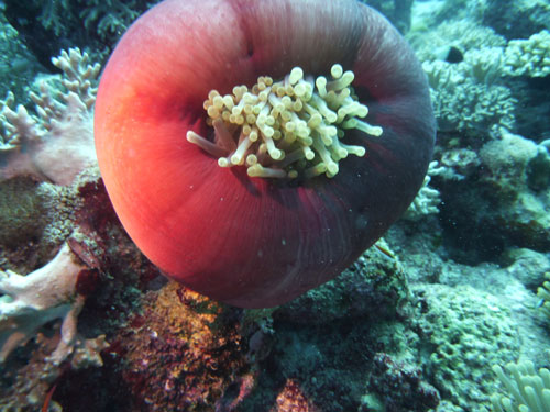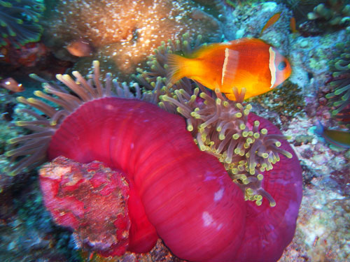 Sui blocchi di corallo crescono anemoni di notevoli dimensioni con gli immancabili pesci pagliaccio. Un pasce pagliaccio mi si avvicina curioso restando protetto dai tentacoli urticanti dell’anemone che lo ospita.