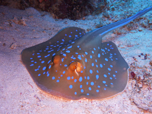 Ripetiamo la prima immersione a Sha’ab Rumi dopo sveglia alle 7:30. La barca è ormeggiata quasi sul punto e scendiamo in drift dive direttamente dalla barca come nelle altre 2 immersioni. Siamo tutti molto felici che ci consentano di fimmergerci ancora qui, dove il tempo sembra sospeso, dove c’è tutto il mondo marino e noi siamo gli intrusi. Si rivedono gli squali grigi in profondità e alcuni di noi avvistano uno squalo martello. Facciamo il primo incontro di straordinaria bellezza con un branco di carangidi che danza con noi, si uniscono, si dividono e si ricompattano di nuovo. Saranno centinaia e il loro colore argento illumina il mare. Durante la risalita incontriamo i miei simpatici amici pappagallo rinoceronte che rompono i coralli come se fosse noccioline e poi eliminano subito i residui. Sicuramente loro non hanno problemi di stitichezza. Facciamo anche un bellissimo incontro con un trigone a macchie blu che ci fissa con quei bellissimi occhi gialli ma non tenta neppure di muoversi anche se eravamo a distanza molto ravvicinata. La seconda immersione la facciamo sul relitto del Blue Belt, un gigantesco cargo che da Jeddah si dirigeva verso Port Sudan e trasportava automobili e pick up Toyota. Lungo 103 metri si schiantò contro il reef di Sha’ab Seudi probabilmente a causa delle brutte condizioni meteomarine.