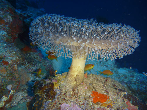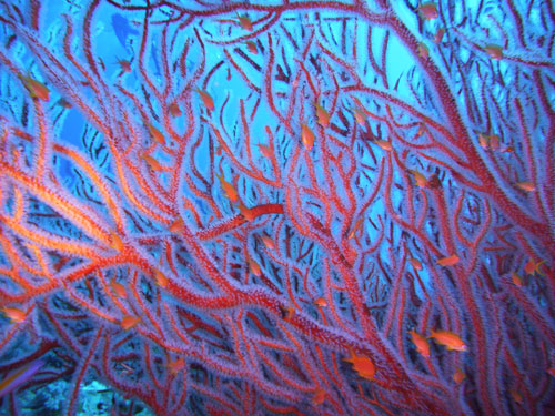 I regolari movimenti dell’acqua portano in quest’area grandi quantità di microrganismi che favoriscono la crescita di enormi gorgonie e rigogliosi cespugli di coralli molli che in alcuni punti crescono così vicini l’uno all’altro da formare una sorta di foresta. Nell’intrico dei rami brulica la frenetica vita di piccoli abitanti di queste delicate formazioni coralline: gobidi che riescono a rendersi quasi invisibili grazie al corpo semitrasparente, pesci falco dal lungo muso appuntito pronti a scattare per afferrare qualche incauta vittima. Piccoli gruppi di triglie gialle nuotano sul reef alla ricerca di pesci di cui cibarsi. Non di rado in mezzo a loro si incontra un carangide che sfruttando la copertura del gruppo può sferrare il suo attacco con scatti fulminei.