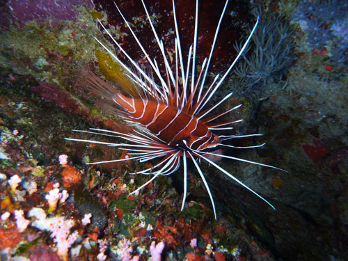 Uno pterois si aggira nei pressi di una gorgonia, lo avviciniamo per immortalarlo con la nostra macchina fotografica. Lui ci fissa con quegli occhioni marroni molto vicini e timido si rigira su se stesso volteggiando per poi addentrarsi in una fessura di una roccia madeporica con l’eleganza delle sue pinne a raggi dove sono nascosti gli aculei velenosi.