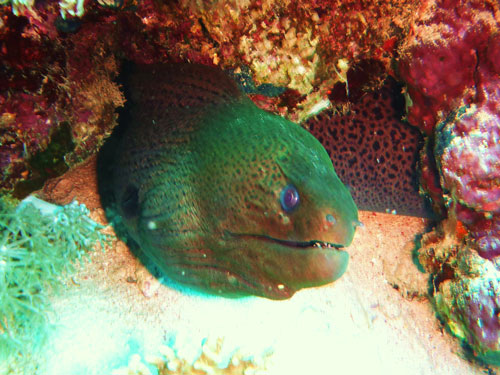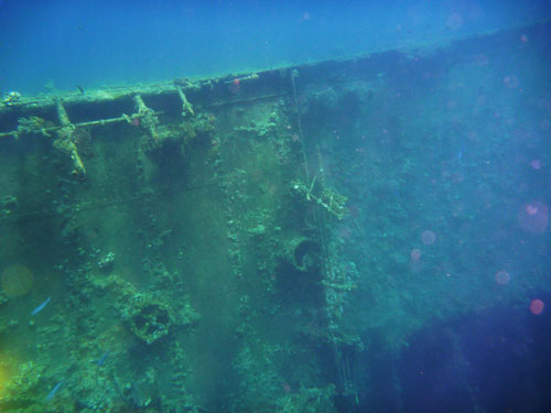 Anche la parete di corallo lì intorno merita una visita. Infatti si incontra un bel Napoleone e due squaletti pinna bianca di scogliera in profondità (non riusciamo a vederli molto bene ma per noi sono i primi squali e c'è euforia!!I Incontriamo molte cernie dei coralli, pesci farfalla e bande di triglie gialle che perlustrano i fondali corallini e che entrano ed escono dal magazzino degli attrezzi che oramai altro non è che un tunnel di ferro lungo non più di 4 metri che poggia sul fondo con qualche alcionario. Terminate le immersioni ci si scambia le prime impressioni con il gruppo. Erano tutti felici di trovare le acque così limpide nel mese di agosto, temevano che il caldo rendesse le acque sudanesi ricche di sospensione e quindi con minore visibilità. Tutto smentito!