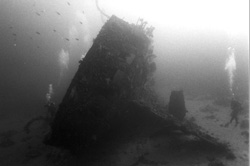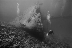 sulle onde, quasi a fare il surf, dritti verso i sub buttatesi a mare,