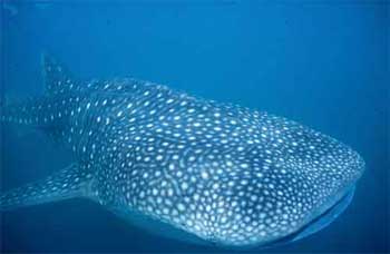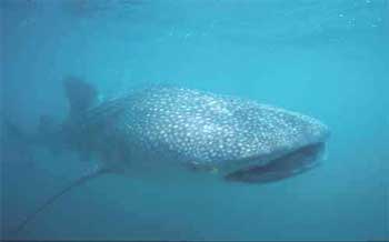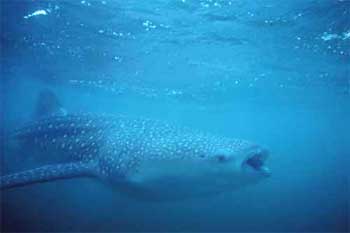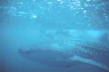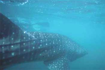 Una pinna enorme solca la superficie e a pochi metri dalla lancia si materializza la sagoma dello squalo balena: procede lento, per nulla turbato dalla nostra presenza. Assolutamente indifferente al rumore del motore procede nella sua direzione, seguendo una scia di plancton a noi invisibile. Si tratta di un esemplare giovane, non arriva a 5 metri di lunghezza, dopo qualche attimo di esitazione mi calo in acqua piano piano e pinneggio regolarmente per seguirlo. Naviga a circa 30 cm sotto la superficie, preceduto da una manciata di piccoli pesci pilota che si piazzano davanti alla sua enorme bocca senza mai finirvi dentro per sbaglio. Grande perizia o semplicemente… è casa loro?