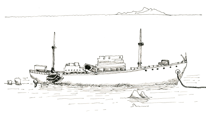 Adagiato su un fondale sabbioso nel canale presente tra l’isola di Gobal Seghir e l’isola di Tawila alla profondità di -50 metri, il relitto si presenta in perfetto assetto di navigazione. L’immersione è impegnativa data la scarsa visibilità, la corrente quasi costante e le notevoli profondità che non permettono di immergersi entro limiti di sicurezza accettabili. Ci limiteremo a descrivere il relitto nei dettagli, consapevoli che per poterlo visitare nella maniera corretta, ci vorranno almeno due o tre immersioni. Seguendo l’albero di poppa ci si porterà sul ponte poppiero posto ad una profondità di circa -33 metri, scendendo lungo la murata si osserva lo squarcio provocato dall’impatto della bomba, da qui si potrà penetrare nella stiva di poppa dove era contenuto il carbone. Si rientra nuovamente sul ponte superiore per ispezionare la cambusa al cui interno ci sono ancora masserie di diverso genere. Tutta la zona poppiera è avvolta da nuvole di glassfish e pterois volitans di straordinari e dimensioni. Superato il parapetto di poppa si raggiunge l’enorme elica a 3 pale (in origine erano 4 pale) e il timone. Passando tra elica e timone si risale sul lato opposto che riconduce sullo specchio di poppa per proseguire fino a raggiungere la zona dove sono presenti gli alloggi dei marinai posti circa a metà nave. Si attraverserà un corridoio dove sul lato destro si trova la cucina e l’accesso alla sala macchine e sul lato sinistro i bagli e gli alloggi ormai totalmente privi di sovrastrutture. Terminato il corridoio ci si troverà nella zona dove era posto il grande fumaiolo con la M ormai caduto e appoggiato sulle sovrastrutture. A questo punto si rientra seguendo il lato destro per raggiungere nuovamente l’albero di poppa ed incontrare le sovrastrutture poste a -33 metri dove sono presenti 3 gavoni. Sul primo gavone a destra si trova l’ancora di rispetto, proseguendo si raggiunge la prua dove si trova l’ancora inserita all’interno dell’occhio di cubia di sinistra mentre l’ancora di destra è appoggiata sul fondale a circa 100 metri di distanza dalla prua lungo la catena. Si risale sulle sovrastrutture dove si incontra il salpancore avvolto da nuvole di glassfish e cernie. Sbirciando nel gavone di sinistra si potranno vedere diverse gomene e barili tutti perfettamente stivati. Procedendo verso l’albero di prua si ispezionerà il ponte di comando del capitano. Per effettuare questa immersione è assolutamente necessario l’utilizzo di torce. Considerando la massiccia presenza di strato ferruginoso presente ovunque, ci si dovrà muovere con estrema cautela cercando di non sollevare il limo presente. L’orario migliore per immergersi sul Rosalie Moller è al mattino in quanto nel pomeriggio l’acqua si intorbidisce creando problemi di visibilità.