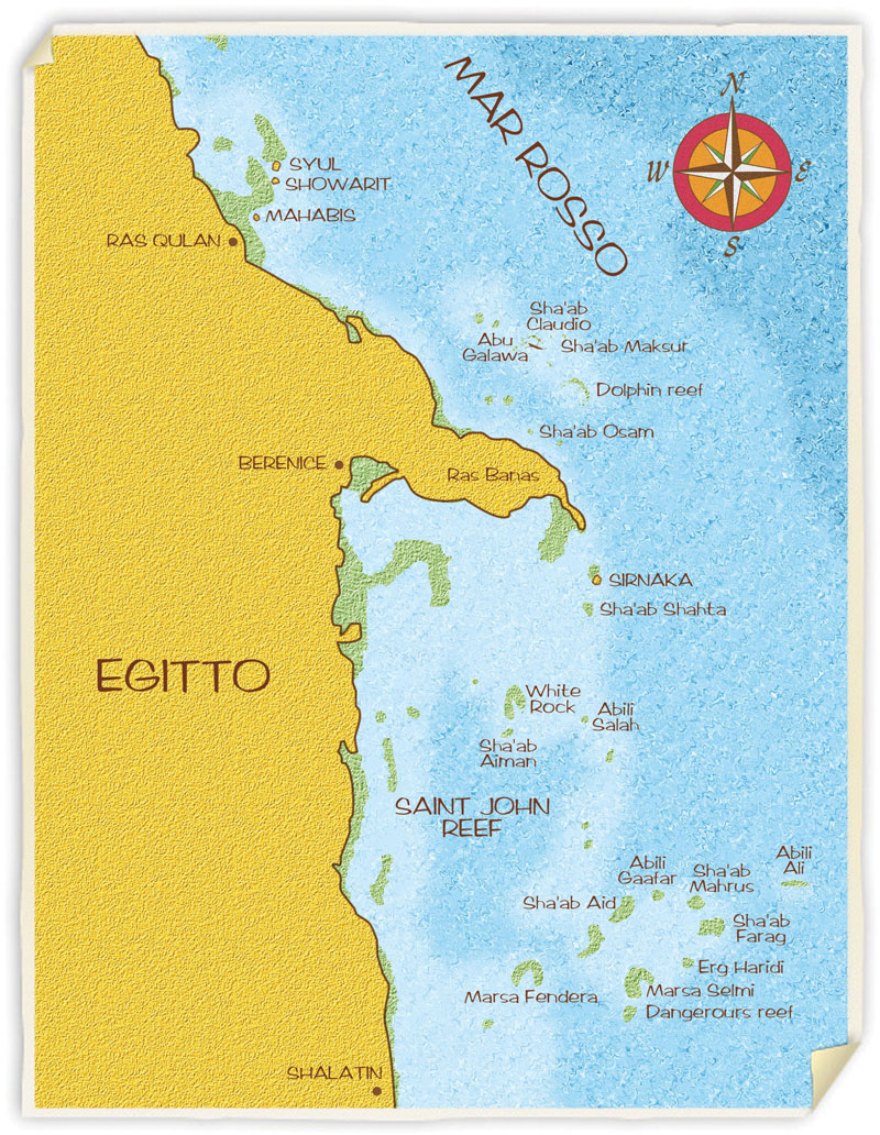 Dal porto di Port Ghalib, navigando per circa 8 ore verso sud raggiungeremo il comprensorio di Saint John dove ci attendono una moltitudine di siti d'immersione che al termine della crociera ci avranno fatto assaporare quanto di meglio offre il Mar Rosso in tutta la sua varietà. Una serie di spettacolari immersioni con differenti caratteristiche, soddisferanno le aspettative di tutti i subacquei. Tra queste meritano una particolare attenzione Abili Seghir o Abili Gaafar, splendidi pinnacoli che si inabissano verticali nel blu, habitat eccezionali per tutte le specie di coralli e pesci. Qui squali e piccoli pesci corallini convivono in totale armonia in un acquario dal quale sarà difficile staccarsi. Sha’ab Mahrus e Gotha Kebir sono reef circolari con pareti rivestite da fitte forme coralline dove si potranno avvistare branchi di pesce pelagico in particolare carangidi e tonni. Le torri coralline di sha’ab Aid poste in pochi metri di profondità permetteranno di godere nella massima rilassatezza delle meraviglie di questo mare oltre ad essere anche l’approdo dove verranno effettuate parte delle immersioni notturne.
