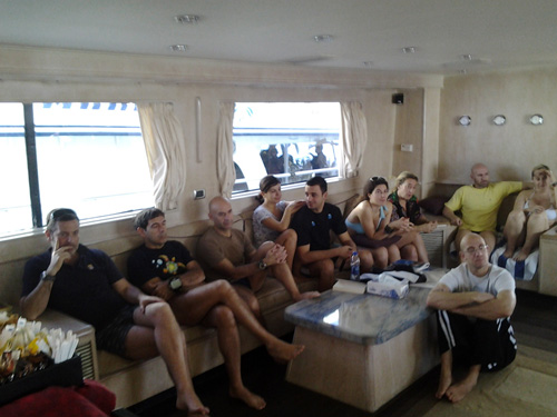 C’è chi cerca lo spazio migliore per distendersi sotto il sole, chi inizia a trafficare con la propria attrezzatura subacquea, chi chiacchera dei mille problemi che crea il traffico di Milano, chi si siede all’ombra per leggere un libro con una tazza di the profumatissimo, chi dorme profondamente e chi non si stente poi tanto bene in navigazione. Cè tutto, tanti diversi colori riuniti sotto un unico desiderio: vivere i ritmi del mare.