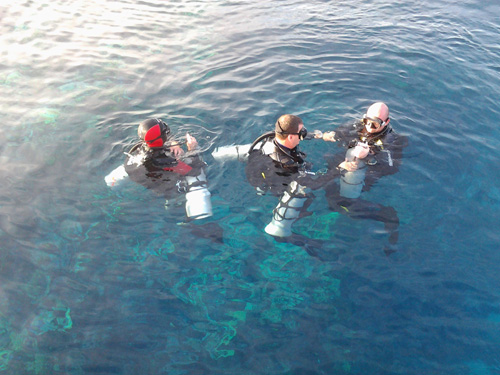 A volte eccitanti soprese ci scatenano, come i gruppi di delfini che ci nuotano accanto giocosi e velocissimi, le tartarughe che risalgono per respirare e restano, curiose, in superficie a guardarci per alcuni minuti, le nuvole di meduse rosa (non sono pericolose!) che ci circondano ed in mezzo alle quali ti puoi tuffare, ed i pesci napoleone che nuotano lentamente nella nostra ombra in attesa che qualcosa di appetitoso cada in acqua “inavvertitamente”, per colpa di una deprecabile abitudine di turisti incoscienti dei danni che provocano.