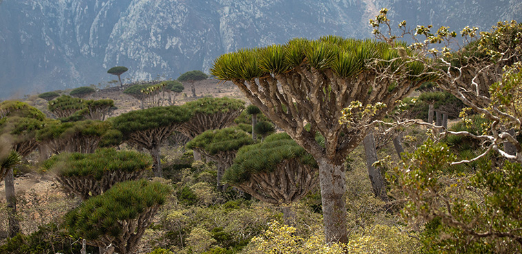 Socotra è definita la “Galapagos dell'Oceano Indiano” in quanto ricchissima di endemismi naturali inseriti in paesaggi di elevata bellezza. A renderla degna di attenzione contribuiscono soprattutto le numerosissime specie botaniche che richiamano l'interesse mondiale anche in campo scientifico. L'incontaminata vegetazione fa di questo luogo la decima isola più ricca del mondo per la varietà della flora esistente. Il suo irresistibile fascino per i biologi risiede nel fatto che Socotra è un vero e proprio "laboratorio" di studio dell'evoluzione biologica. La flora primitiva presente, con le sue circa 850 specie di piante di cui circa 240 endemiche - molte delle quali sono resti di fiori antichissimi scomparsi dalla terra da lunghissimo tempo - è talmente abbondante da mantenere intatte condizioni molto simili alle ere preistoriche. La pianta più antica dell'isola è il famoso è il Dragon’s Tree “l’albero del drago” il cui nome deriva dal fatto che incidendone il tronco ne fuoriesce un liquido rosso (il cinabro), attribuito, secondo antiche credenze, al sangue di drago versato durante un cruento combattimento fra un drago ed un elefante.