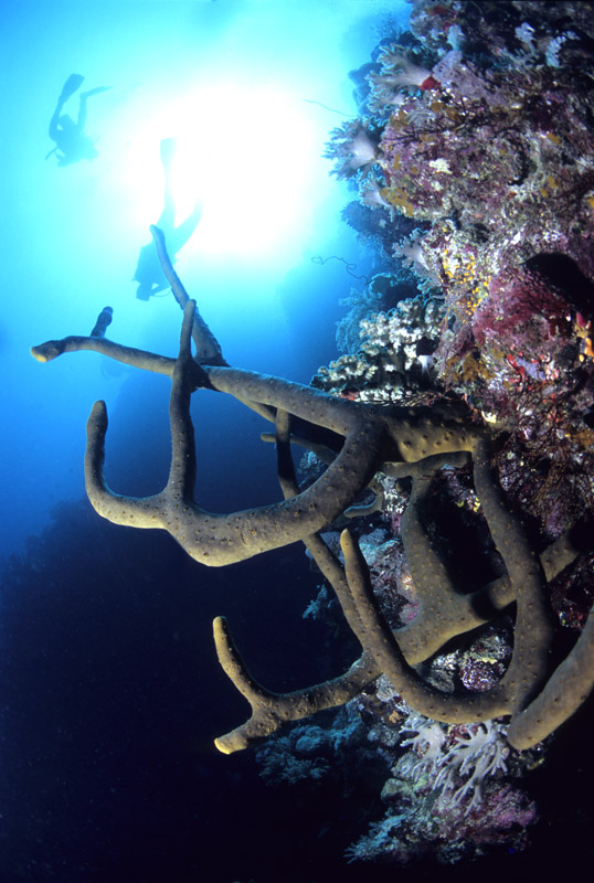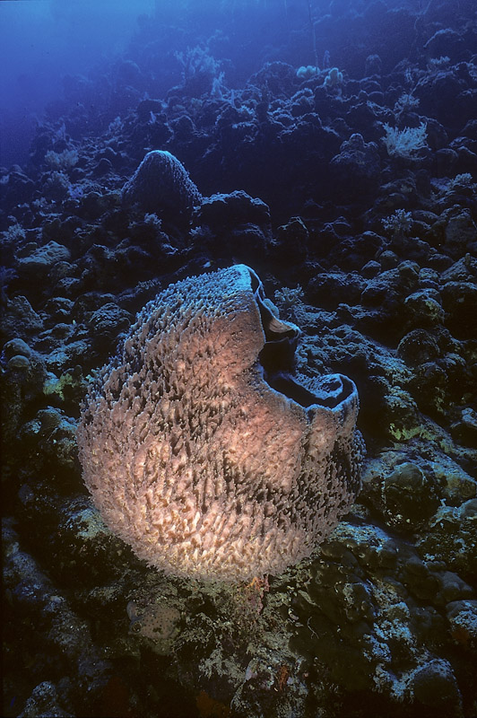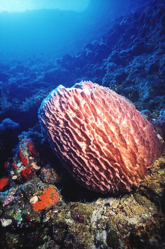 Non vi è posto nel reef dove non siano presenti le spugne anche se il nostro occhio coglie solo le forme più vistose, ovvero una minima percentuale rispetto alla totalità di spugne presenti in quello spazio di reef. Sia su un fondo duro che su un fondo mobile, sia in superficie che a grandi profondità, le spugne sono parte integrante del reef e contribuiscono al consolidamento strutturale della comunità intera. Molte spugne non le individuiamo facilmente perchè hanno forme estremamente piatte, sono incrostanti o addirittura crescono all'interno di madrepore o di rocce di origine calcarea, perforandole "chimicamente". Questo grazie all'azione di secrezioni acide della spugna che, sciogliendo il carbonato di calcio di cui son fatte le madrepore, permettono alla spugna di crescere all'interno delle madrepore stesse. Le forme più vistose solitamente sono più evidenti man mano che si scende perchè, con l'aumentare della profondità diminuisce la luce e quindi il predominio delle madrepore “zooxantellate”,cioè quelle madrepore che costruiscono attivamente i reef grazie alla loro simbiosi con microalghe conosciute come zooxantelle.