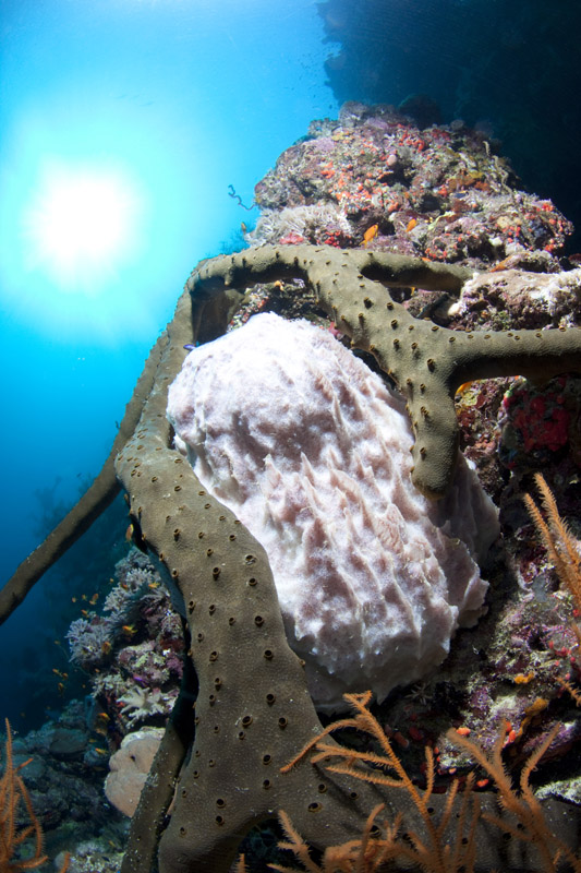 Considerando le innumerevoli specie di spugne presenti nel mondo marino, non possiamo certo generalizzare e spiegare come si fotografano. Esiste una tale varietà di forme, colori e dimensioni che risulta alquanto difficoltoso parlarne come se si trattasse di un unico esemplare. Naturalmente non dimentichiamoci mai che stiamo parlando di animali presenti nelle acque del Mar Rosso e non in altri mari. Dico questo perchè difficilmente in Mar Rosso si potranno incontrare le grosse spugne dai colori vivaci che si osservano nelle acque indonesiane o in quelle del Pacifico. Basti pensare alle spugne volgarmente chiamate candelabro o barile che nei fondali Pacifici sono di colorazione gialla o rossa mentre in Mar Rosso sono di un colore brunato con forte attitudine all'assorbimento della luce. La differenza sta tutta nella loro colorazione che a livello fotografico fa una bella differenza. In ogni caso i grossi esemplari di spugna dalle forme bizzarre sono soggetti divertenti per essere fotografati e ambientati nel reef corallino utilizzando una fotocamera con obiettivo grandangolare. Sarà importante dosare la luce del flash in modo da illuminare correttamente il soggetto principale senza penalizzare il resto dell'immagine. Per questo motivo sarà fondamentale sfruttare anche la luce esterna che servirà a modellare l'ambiente circostante. Se disponete di un unico flash, questo dovrà essere tenuto ben dietro la vostra custodia in modo da illuminare anche parte della barriera corallina. Non dimenticatevi di controllare che l'esposizione sia corretta prima dello scatto finale. Nei soggetti colorati le problematiche saranno minori e potrete dare spazio alla vostra fantasia. Ricordatevi sempre di contestualizzare il soggetto all'ambiente nel quale si trova, in questo l'uso del grandangolo vi sarà di aiuto. Non dimentichiamoci mai che il rispetto per l'ambiente deve essere primario rispetto al resto, quindi evitare qualsiasi situazione che possa anche solo minimamente deturparlo.