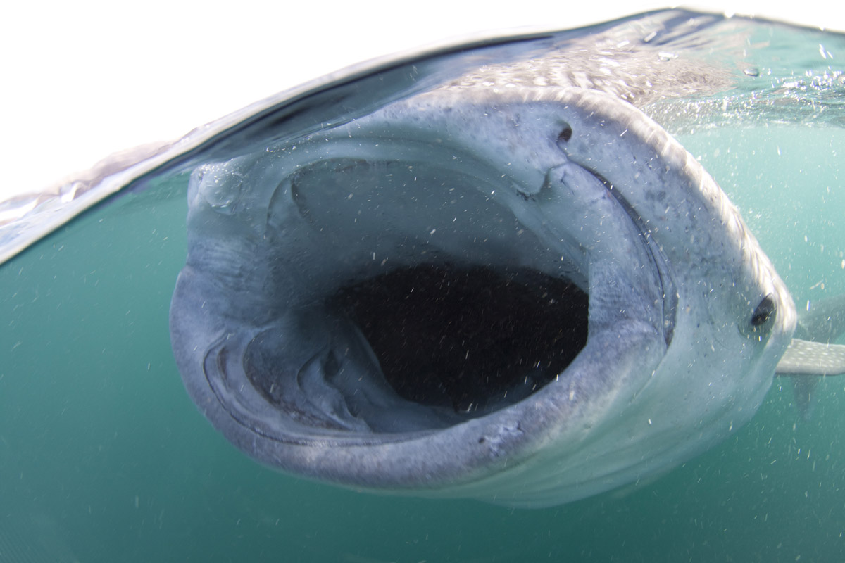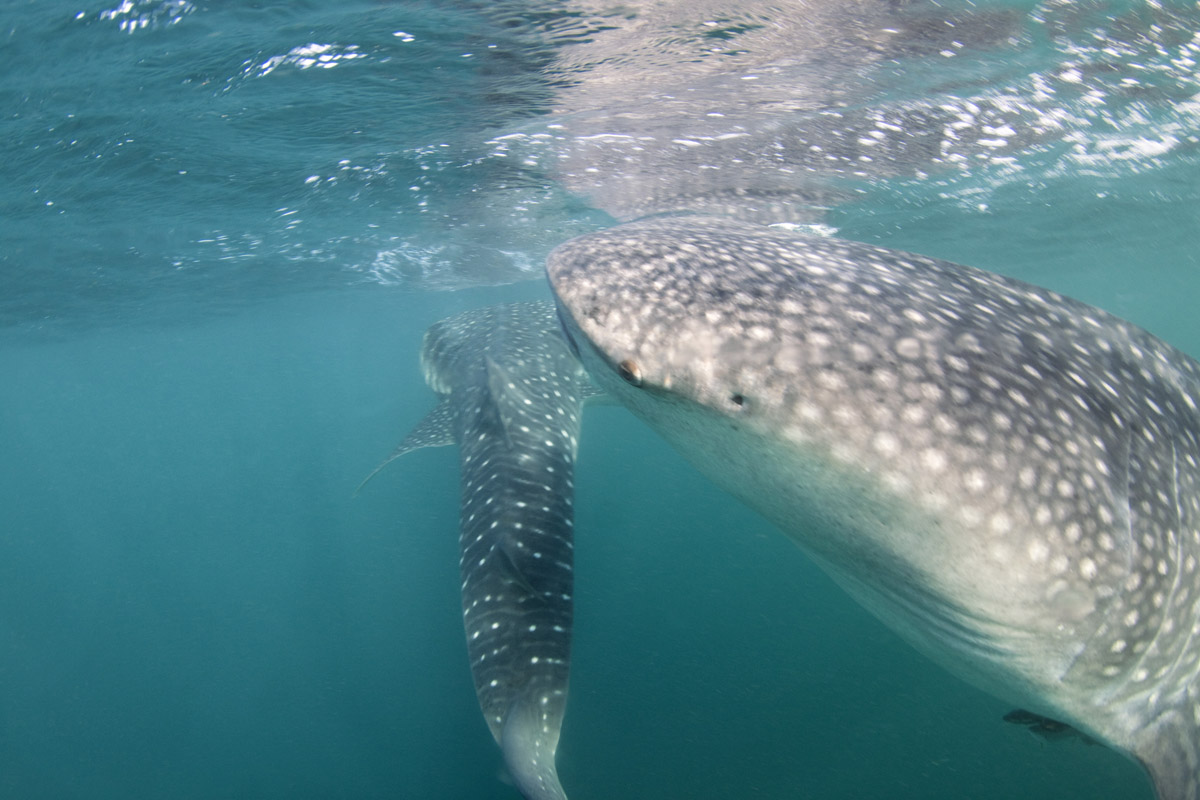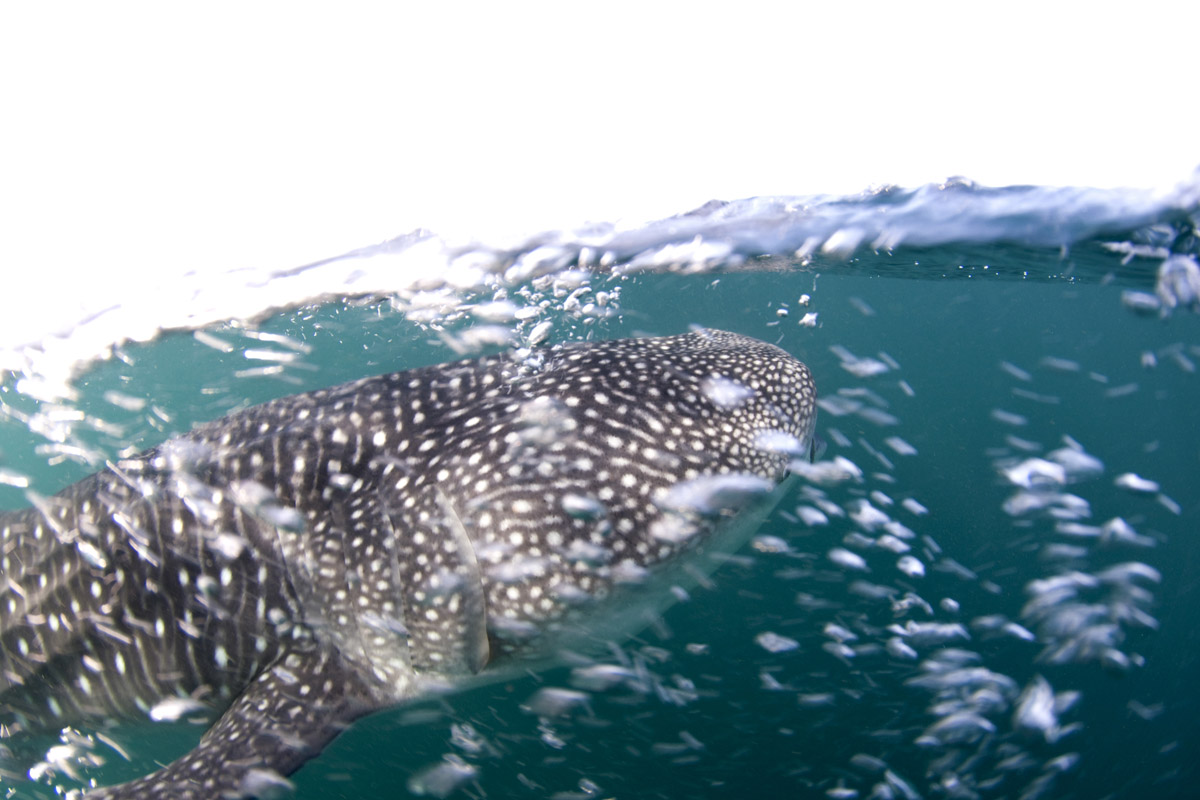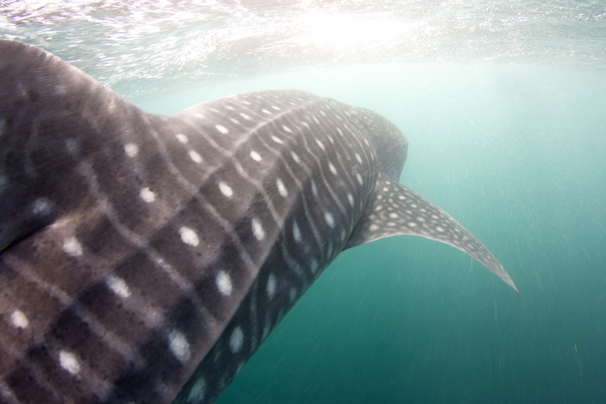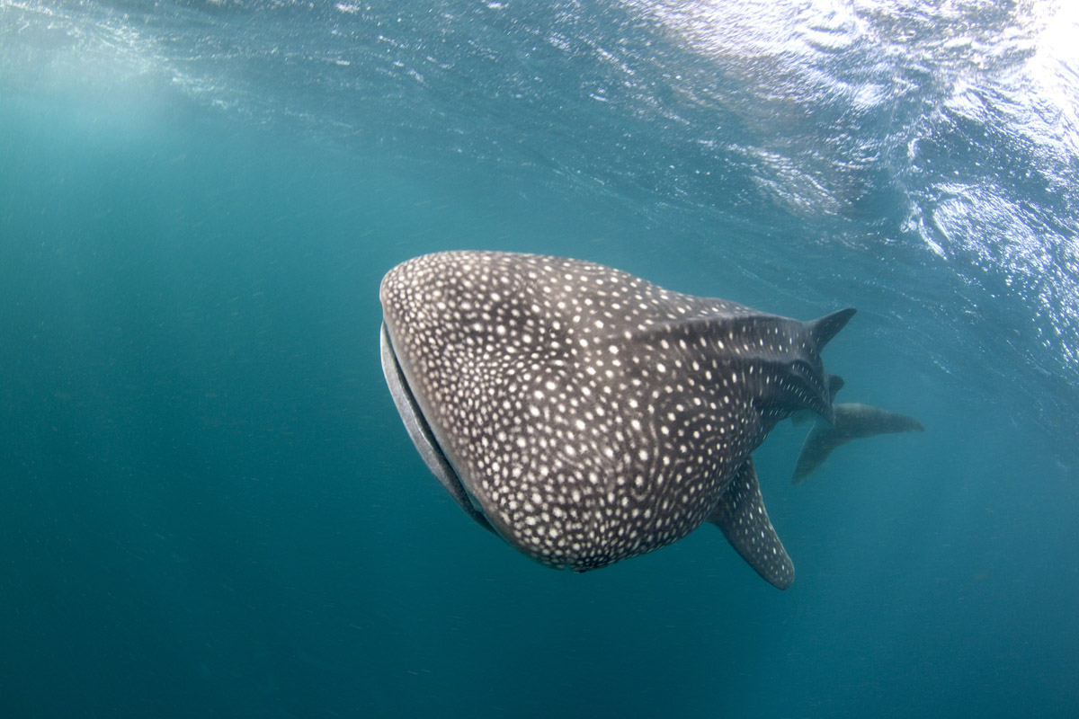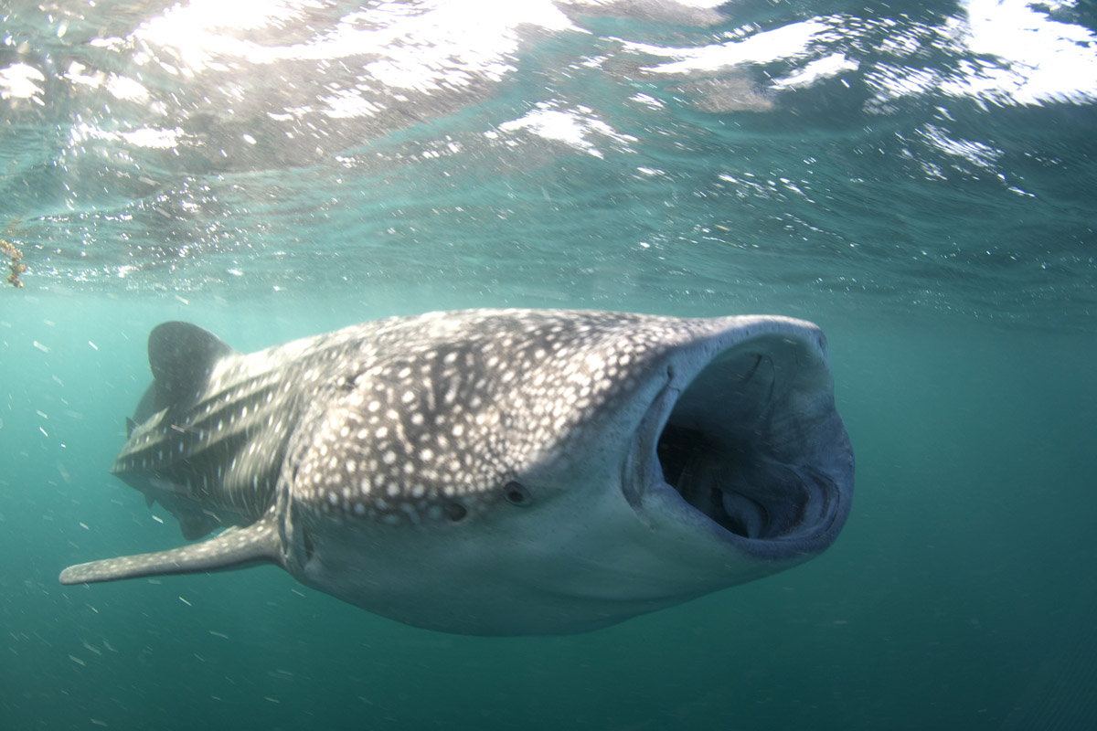 Rhincodon typus, il pesce più grande del mondo che non a caso è un grande mangiatore di plancton, cosmopolita di mari caldi tropicali. Corpo massiccio con evidenti carenature lungo i fianchi e pinna caudale eterocerca; testa molto larga, appiattita con una bocca ampia ed ellittica. Inconfondibile è la colorazione verdastra costellata da particolarissime macchie bianche.