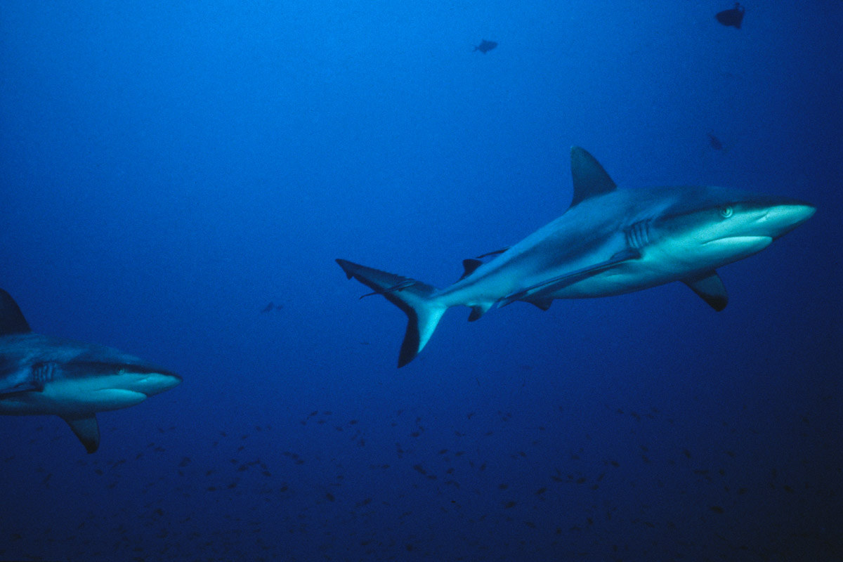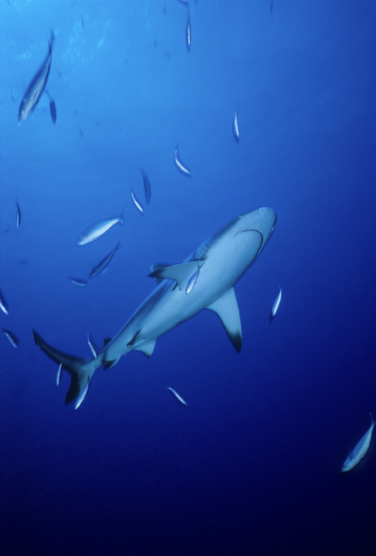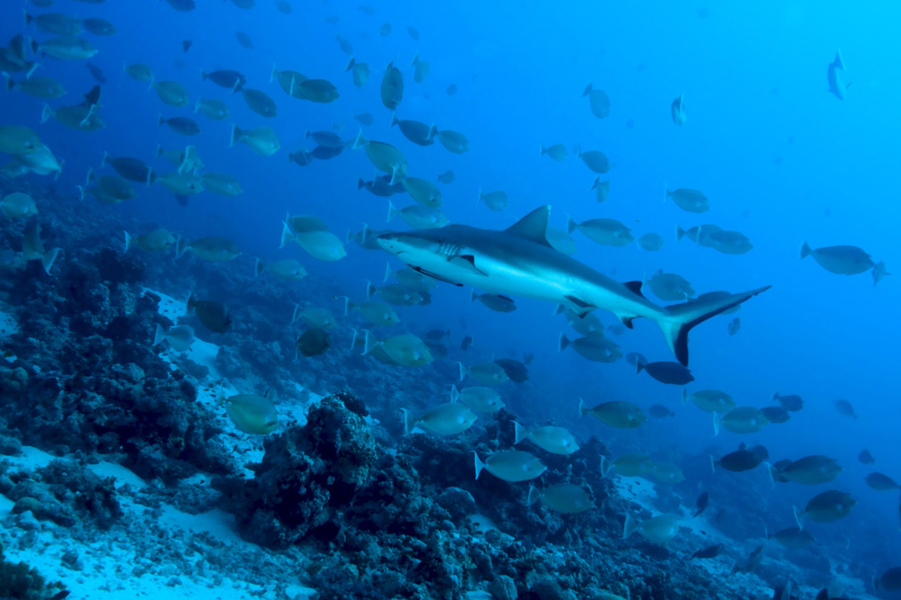 Un altro "must" tra gli amanti del blu del Mar Rosso è il Carcharinus Amblyrhynchos, conosciuto ai più con il nome volgare di squalo grigio. Raggiunge i due metri circa di lunghezza ed è riconoscibile dal bordo nero della pinna caudale, come neri sono anche i bordi delle pinne dorsali. Il resto del corpo è tendenzialmente grigio con sfumature più scure sul dorso e più chiare sul ventre da buon organismo che sfrutta la "contrombreggiatura" per mimetizzarsi nella colonna d'acqua. La sua forma è quella classica degli squali con un muso largo ed arrotondato ed occhi grandi. La maggior parte degli esemplari non supera il metro e mezzo di lunghezza. Come gli altri squali della famiglia, il Carcharhinus Amblyrhynchos è viviparo, cioè la madre alleva gli embrioni attraverso una connessione placentale. Con cadenza annuale vengono alla luce cucciolate composte da un numero variabile tra uno a sei squaletti. dopo 12 mesi di gestazione.