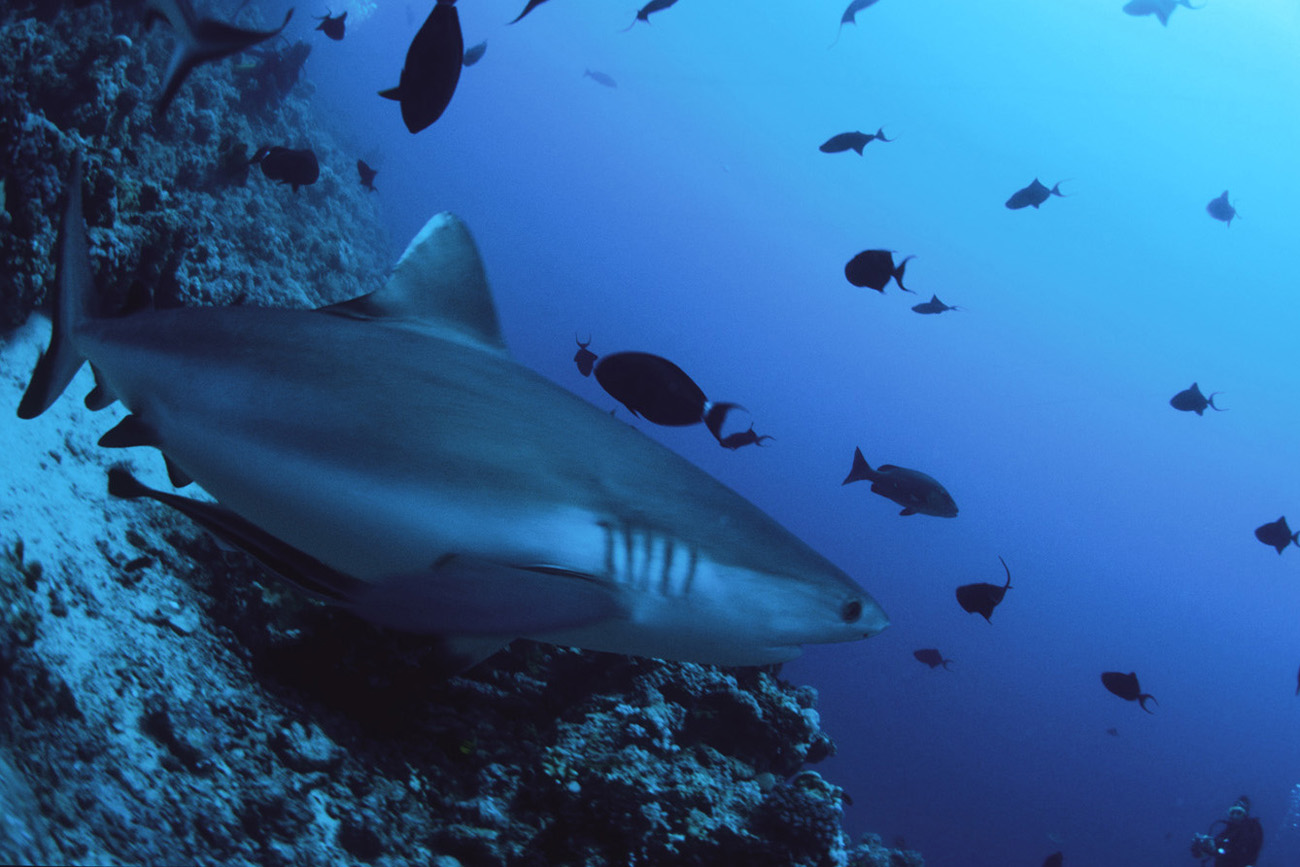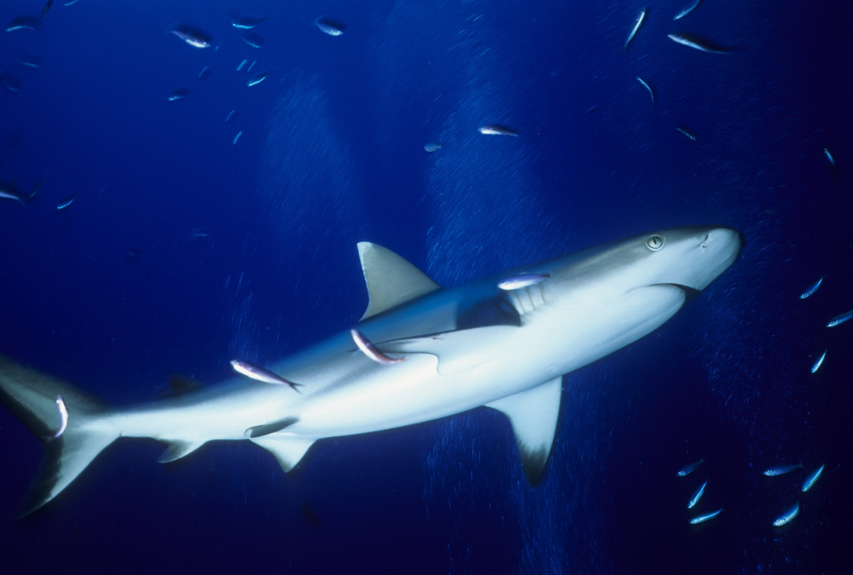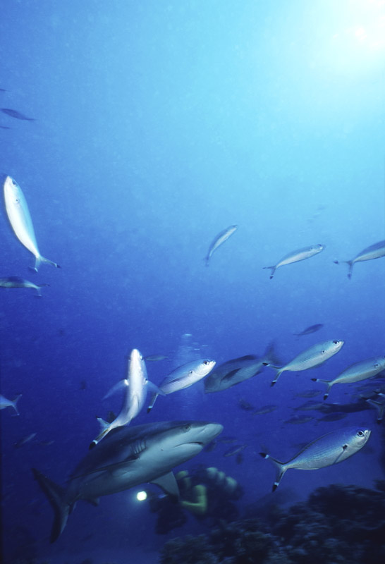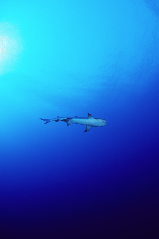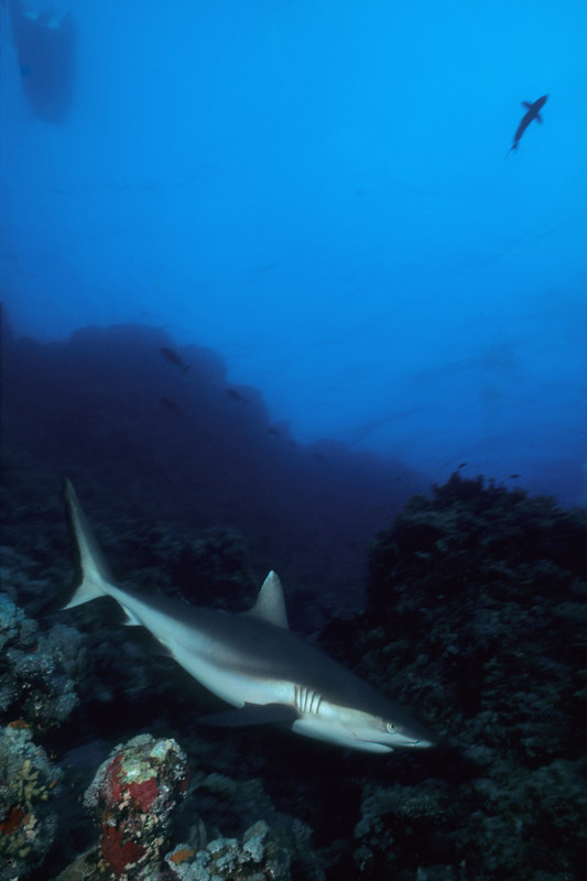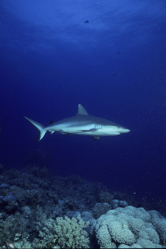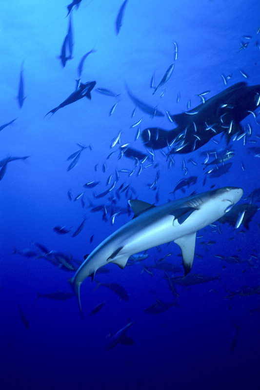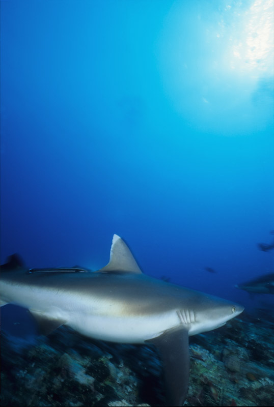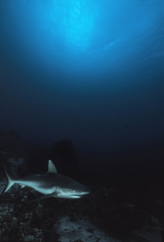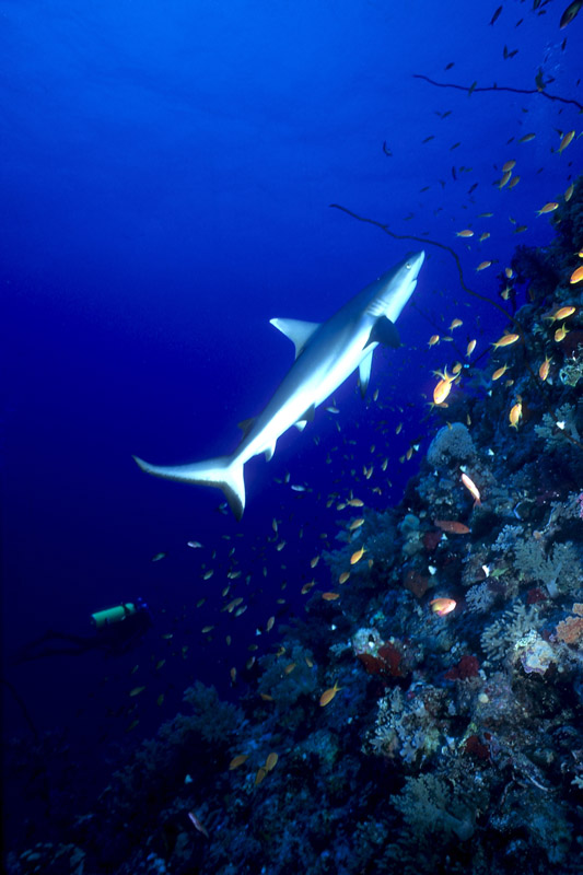 Splendido soggetto lo squalo grigio, ma non proprio semplice da fotografare perchè tende a mantenersi a distanza di sicurezza come buona parte dei grossi predatori. Non saranno molte le occasioni nelle quali lo squalo ci offrirà le condizioni perfette per riprenderlo ma in molti casi dovremo accontentarci e sfruttare al meglio la condizione in cui ci troviamo, d'altro canto stiamo parlando di un grosso pesce che tende a muoversi prevalentemente nel blu. Fondamentale sarà la tecnica di avvicinamento al soggetto durante la quale dovremo disturbarlo il meno possibile. Una volta a tiro di obiettivo sarà necessario decidere l'inquadratura migliore per poi allungarsi con tutto il corpo verso il soggetto in modo da accorciare ulteriormente la distanza che ci separa da lui prima di iniziare a scattare. Sarà anche possibile incontrare lo squalo grigio mentre nuota su un pianoro corallino e in quel caso le possibilità di ottenere un buon risultato saranno maggiori anche grazie all'ambiente circostante che ci permetterà di contestualizzare molto meglio il soggetto. Se poi saremo assistiti dalla fortuna, potrà capitare che lo squalo ci si avvicini al punto da poter ricevere anche un leggero ma fondamentale colpo di flash che servirà a staccare il colore della sua livrea grigia dal fondo. Una pennellata di luce nel punto giusto ma necessaria per ottenere una bella immagine. In questo caso, dato che non avremo molte possibilità di rimanere a contatto ravvicinato con il pesce, sarà importante puntare il flash verso la zona più scura della sua livrea in modo da illuminarlo quel tanto che servirà a dare forma al soggetto. Prima di scattare fate in modo che il soggetto abbia una forma dinamica offrendo la sensazione del movimento e non di staticità come spesso accade quando si riprende uno squalo di fianco.