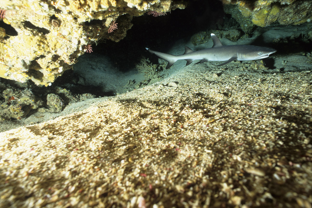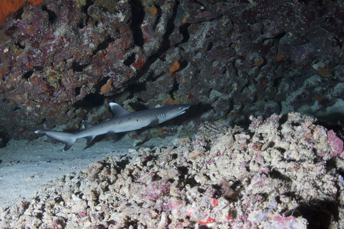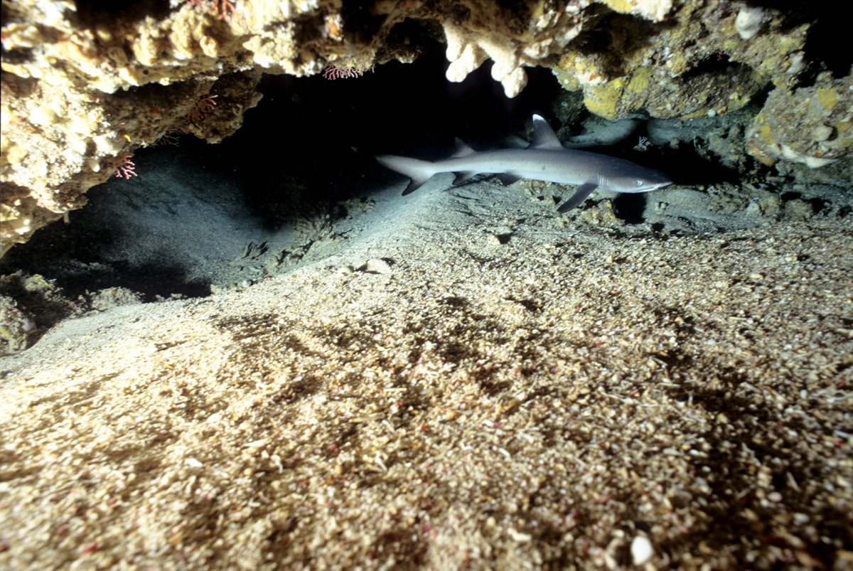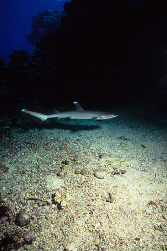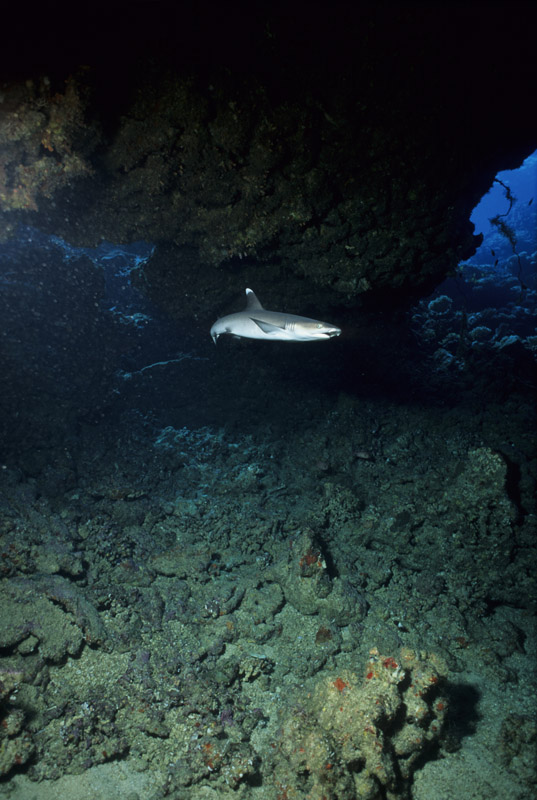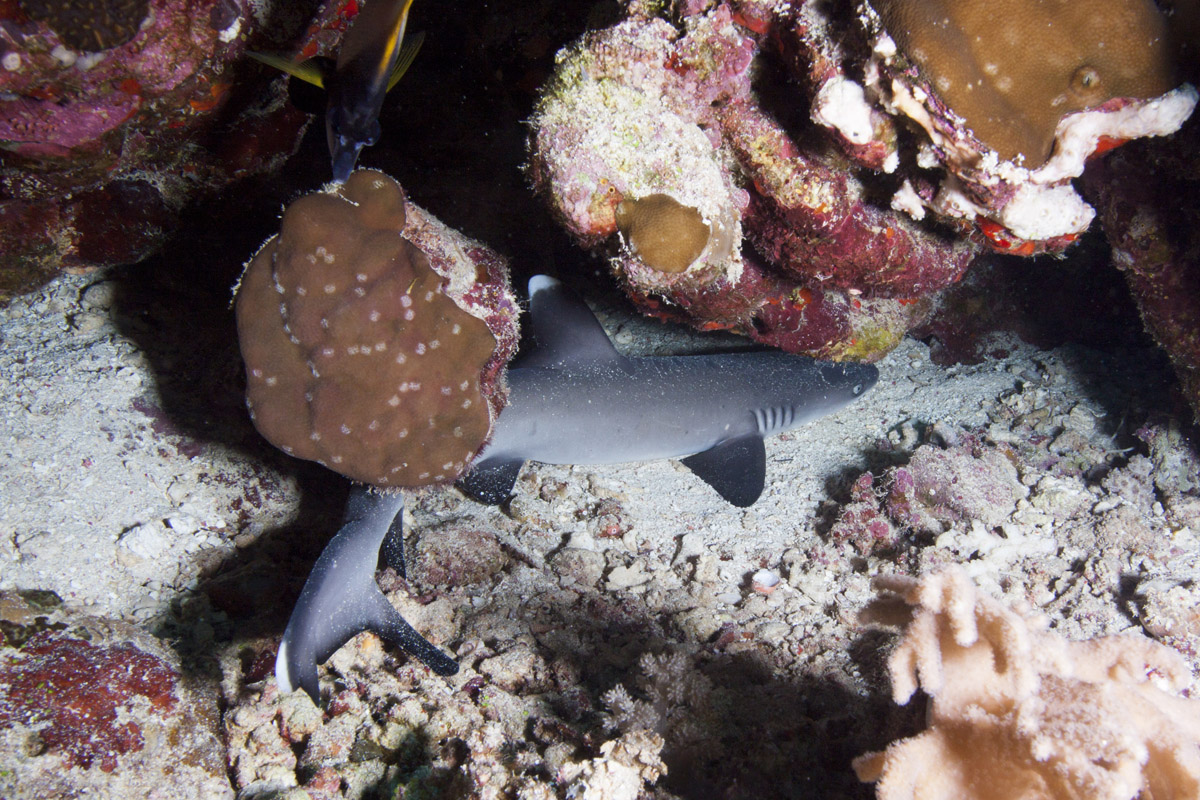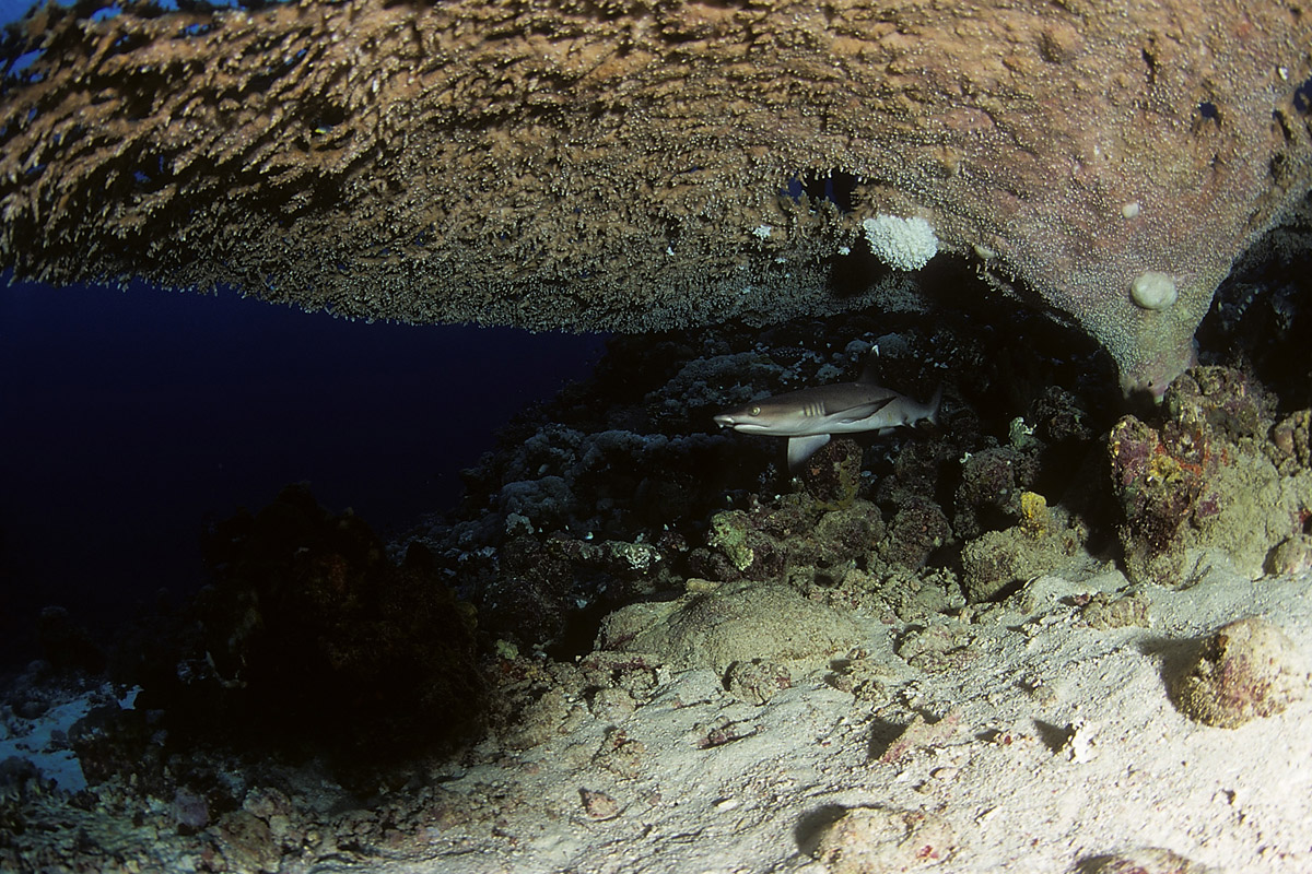 Come abbiamo visto dalle sue abitudini, lo squalo pinna bianca potrà essere incontrato in due situazioni totalmente differenti ovvero: adagiato sul pianoro di un reef, mentre sonnecchia sotto una acropora oppure mentre nuota nel blu. Nel primo caso, in particolare quando si trova a nuotare in grotta o a sonnecchiare sotto una acrocora, le possibilità di ottenere belle immagini sono sicuramente maggiori di quando lo incontreremo a nuotare nel blu. Questo per via della distanza che ci separa dal soggetto. In ogni caso sarà importante, anche nel primo caso, fare attenzione al colpo di flash che dovrà illuminare correttamente il soggetto ma allo stesso tempo non dovrà creare macchie di sovraesposizione sulla sabbia o sul corallo. Sarà importante mantenere il flash ad una distanza tale da non colpire direttamente la sabbia corallina. Non dimenticatevi che la livrea dello squalo assorbe molta luce pertanto fate molta attenzione all'intensità del colpo di luce e alla sua direzione. Tutt'altro discorso è quello che riguarda invece il soggetto mentre nuota in mare aperto e difficilmente sarà così vicino da poter essere colpito dalla luce del flash. In questo caso potrete sfruttare l'ambiente circostante come scenografia della vostra immagine ed il piccolo squalo come soggetto in secondo piano a meno che non siate così fortunati che vi passi molto vicino. Un grandangolare medio è certamente l'obiettivo che vi garantirà la maggior resa dal punto di vista qualitativo mentre, nel caso degli squali in grotta anche con un grandangolo spinto potrete ottenere un ottimo risultato.