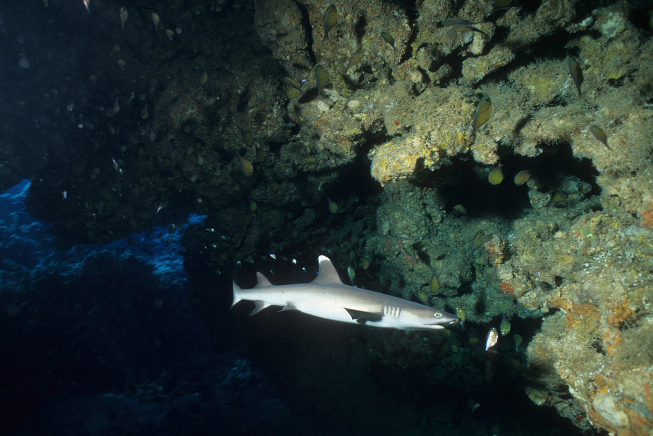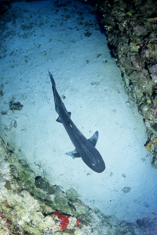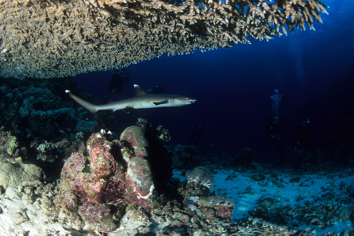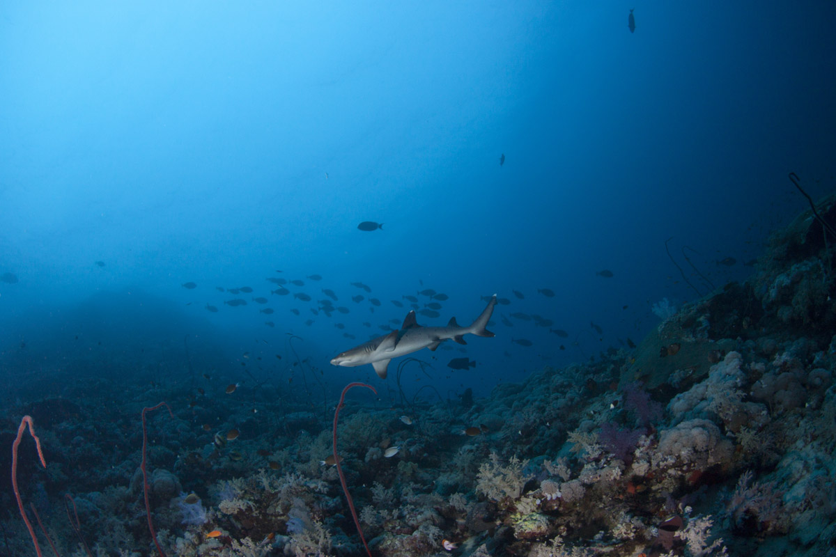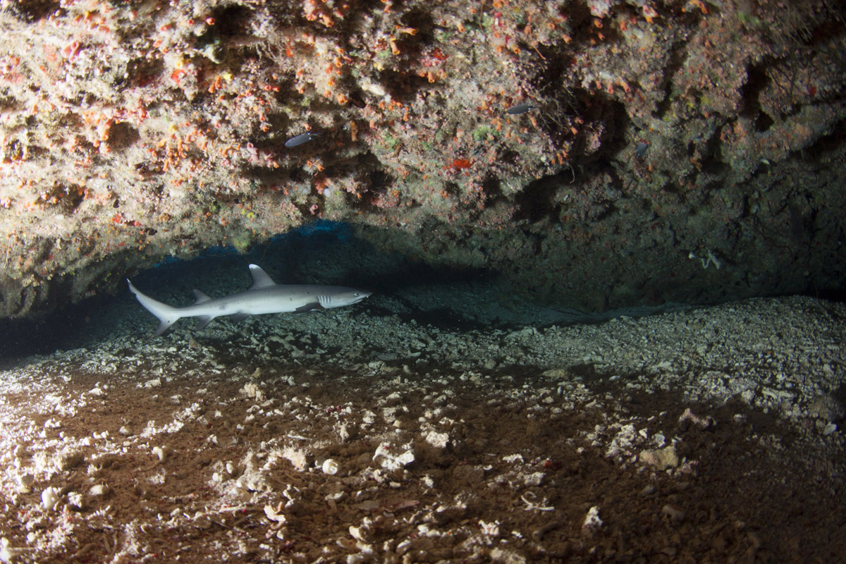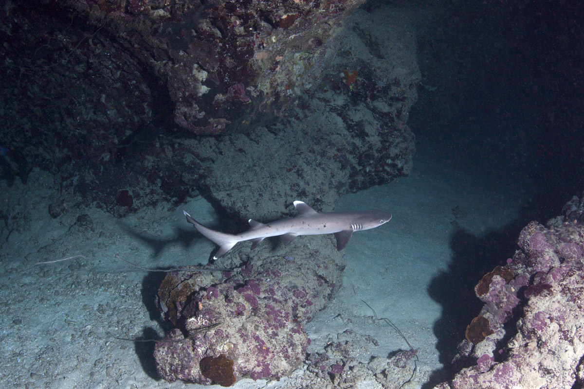Come abbiamo visto dalle sue abitudini, lo squalo pinna bianca potrà essere incontrato in due situazioni totalmente differenti ovvero: adagiato sul pianoro di un reef, mentre sonnecchia sotto una acropora oppure mentre nuota nel blu. Nel primo caso, in particolare quando si trova a nuotare in grotta o a sonnecchiare sotto una acrocora, le possibilità di ottenere belle immagini sono sicuramente maggiori di quando lo incontreremo a nuotare nel blu. Questo per via della distanza che ci separa dal soggetto. In ogni caso sarà importante, anche nel primo caso, fare attenzione al colpo di flash che dovrà illuminare correttamente il soggetto ma allo stesso tempo non dovrà creare macchie di sovraesposizione sulla sabbia o sul corallo. Sarà importante mantenere il flash ad una distanza tale da non colpire direttamente la sabbia corallina. Non dimenticatevi che la livrea dello squalo assorbe molta luce pertanto fate molta attenzione all'intensità del colpo di luce e alla sua direzione. Tutt'altro discorso è quello che riguarda invece il soggetto mentre nuota in mare aperto e difficilmente sarà così vicino da poter essere colpito dalla luce del flash. In questo caso potrete sfruttare l'ambiente circostante come scenografia della vostra immagine ed il piccolo squalo come soggetto in secondo piano a meno che non siate così fortunati che vi passi molto vicino. Un grandangolare medio è certamente l'obiettivo che vi garantirà la maggior resa dal punto di vista qualitativo mentre, nel caso degli squali in grotta anche con un grandangolo spinto potrete ottenere un ottimo risultato.