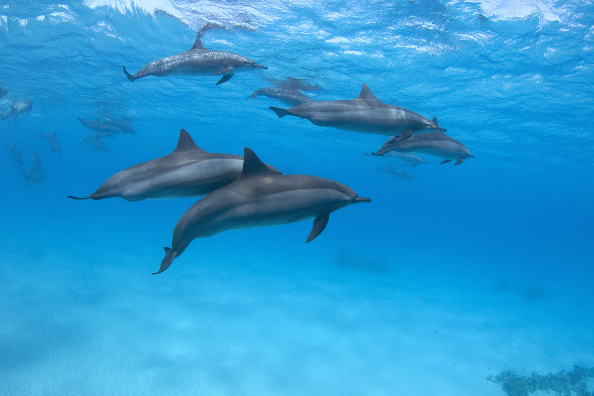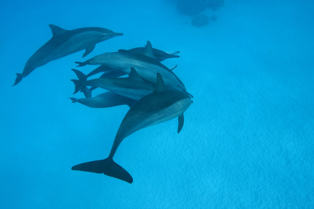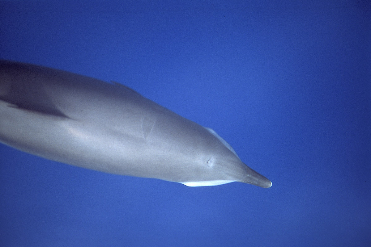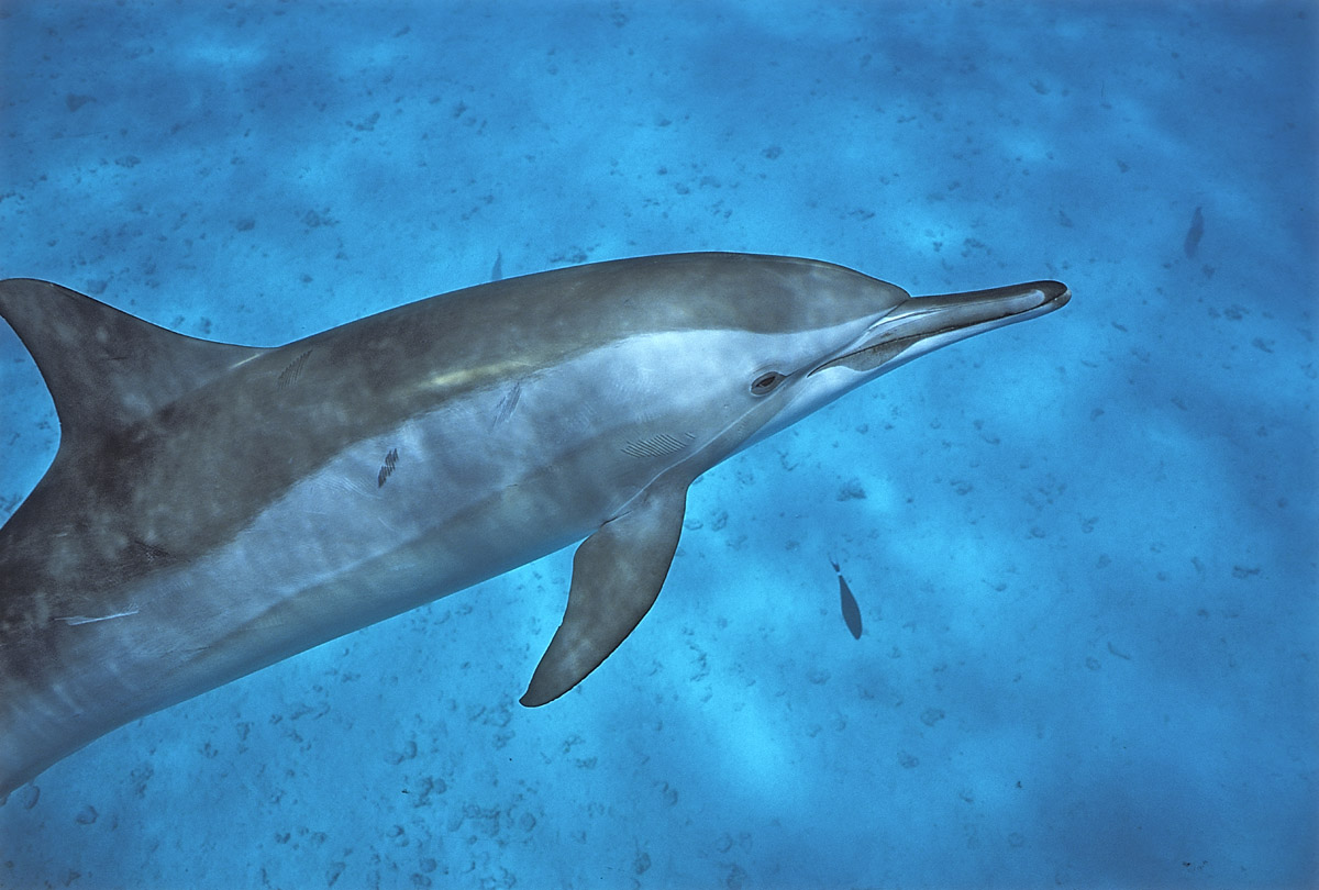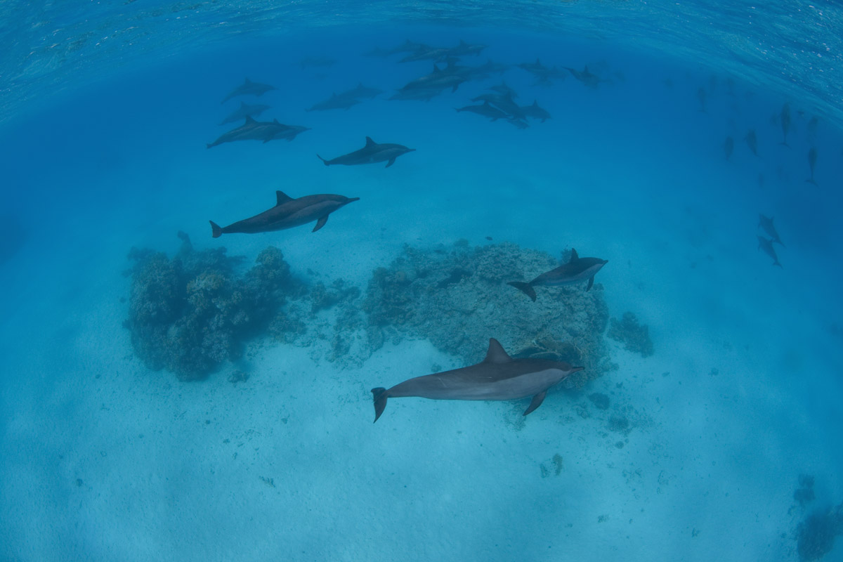 Riprendere un delfino è il sogno di ogni fotografo. Non è poi neanche così difficile intuirne il motivo dato che questo mammifero così come pochi altri mammiferi, costituiscono il contatto più stretto tra noi umani e la razza dei mammiferi marina. Certo è che non sarà molto semplice imbattersi in un delfino nel corso di una immersione con le bombole mentre lo sarà molto di più in apnea o nel corso di una navigazione. L'incontro con i delfini in immersione potrà accadere soltanto quando saranno loro a decidere di avvicinarsi al subacqueo perchè in uno stato particolare di curiosità se no difficilmente potrà avvenire un incontro casuale. Fatta questa premessa parliamo ora dell'incontro in apnea che sarà quello più semplice soprattutto in Mar Rosso dove, come abbiamo già detto, esistono siti nei quali intere famiglie di stenelle nuotano tranquille e indisturbate. Generalmente li si incontra all'interno delle lagune nelle quali vanno a proteggersi dopo una giornata di caccia in mare aperto. La tecnica di avvicinamento è molto semplice dato che la si potrà effettuare in gommone portandosi nella zona in cui nuota il branco. Scendete in acqua e attendete pazientemente il loro arrivo, il delfino è un animale molto curioso e sarà lui ad avvicinarsi. A quel punto dovrete nuotare seguendo i suoi movimenti ma senza affannarvi più del dovuto, certamente effettueranno diversi passaggi e avrete le vostre opportunità di fotografarli. Generalmente i delfini in laguna nuotano in fondali bassi su fondo di sabbia chiara e riflettente; una condizione perfetta per poterli riprendere anche senza il bisogno di usare il flash. Le tecniche di ripresa in queste condizioni possono essere diverse considerando le innumerevoli scelte di inquadratura: fotografarli in superficie oppure effettuare delle apnee in modo da riprenderli mentre sono in immersione o in controluce oppure ancora dall'alto verso il basso mentre nuotano rasenti al fondo. In tutti questi casi consigliamo sempre di usare un medio grandangolo se non addirittura un grandangolo spinto dato che potrete avvicinarvi abbastanza da giustificare l'uso di un bell'obiettivo grandangolare. Tenete presente che la livrea della stenella è grigia, sarà quindi necessario fotografarlo sfruttando al meglio la luce esterna che dovrà illuminare l'animale dalla parte in cui lo state riprendendo. Un altro consiglio da non dimenticare è quello di usare un tempo di sincronizzazione uguale o maggiore alla lunghezza focale dell'obiettivo che state usando in modo da non rischiare di realizzare immagini mosse. Il delfino anche quando sembra muoversi lentamente starà sempre nuotando ad una velocità tale da dover bloccare il suo movimento.