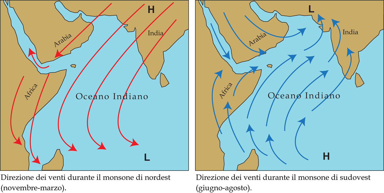 Le prime e più sofisticate tecniche di navigazione si sono sviluppate nell’Oceano Indiano e sono frutto dell’interazione tra le varie culture che occupavano le sponde di questo mare. Gli Indiani erano considerati abili navigatori e furono tra i primi a comprendere e sfruttare il regime stagionale dei monsoni. I viaggi verso ovest erano condotti da ottobre a marzo, con il monsone di nord-est, quelli di ritorno verso est si svolgevano tra aprile e settembre, sfruttando il monsone di sud-ovest.