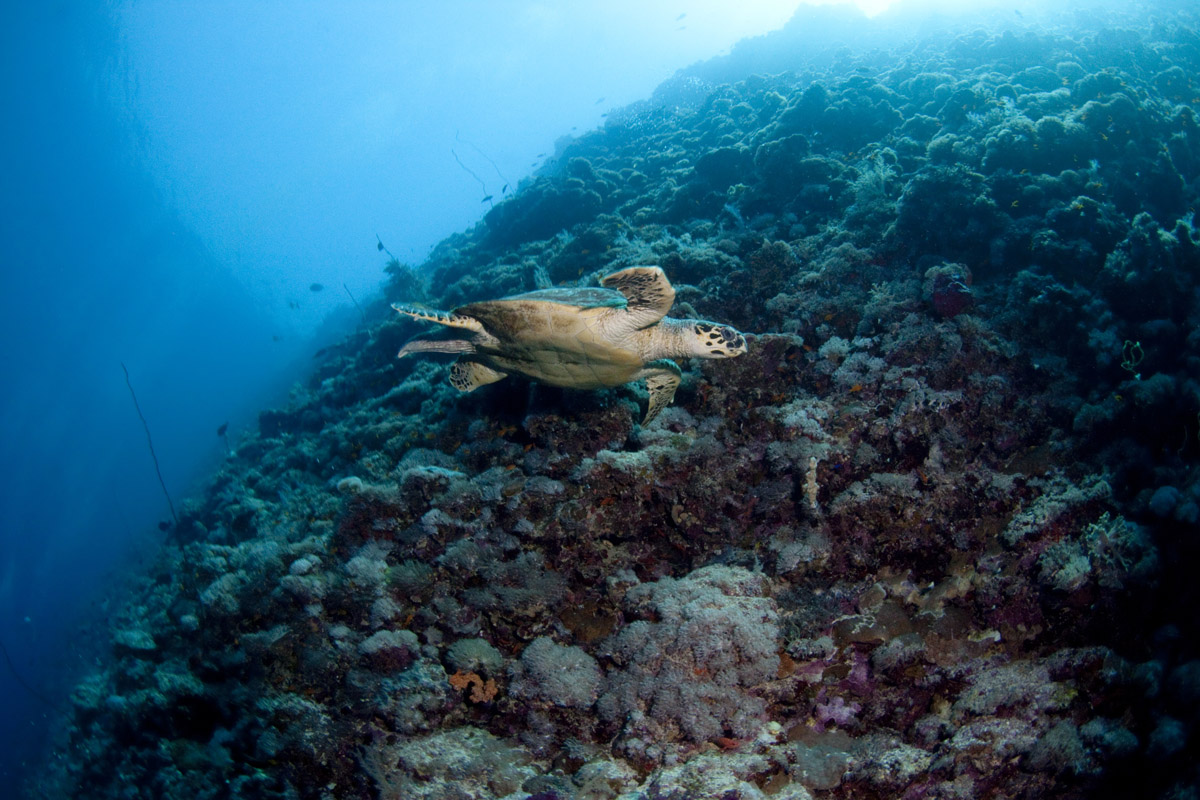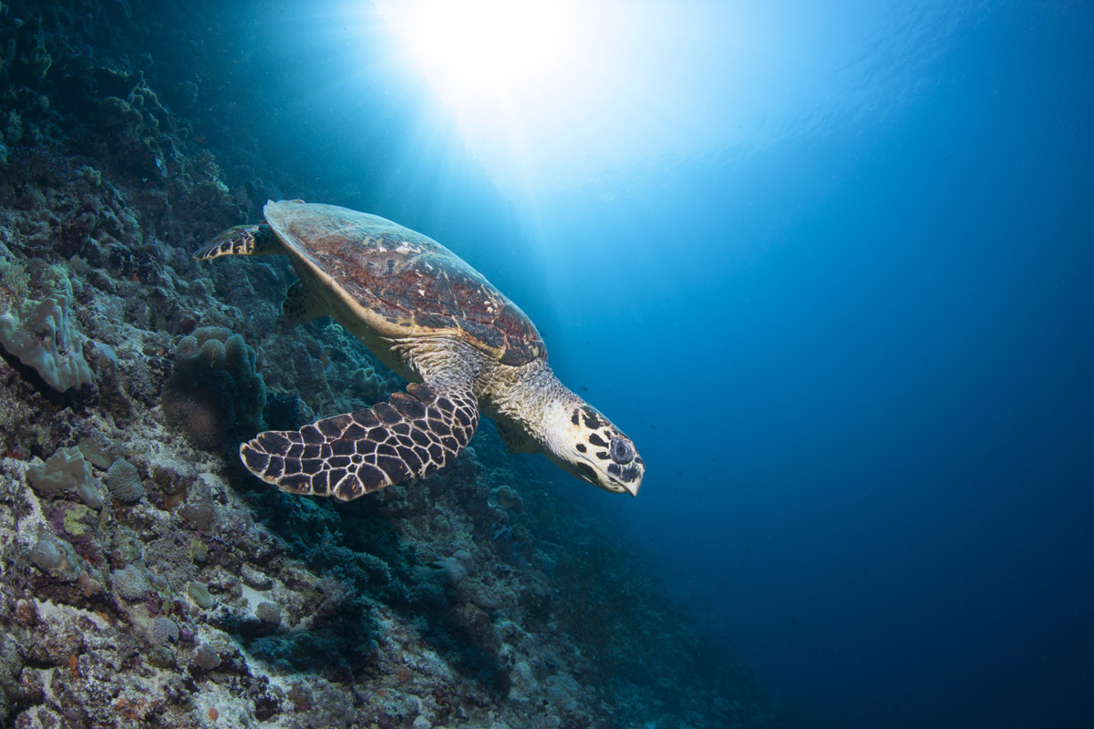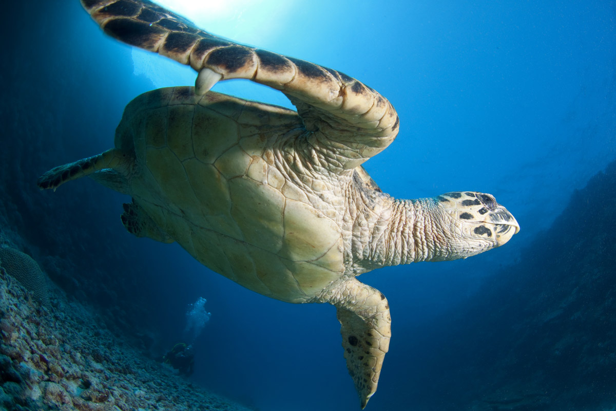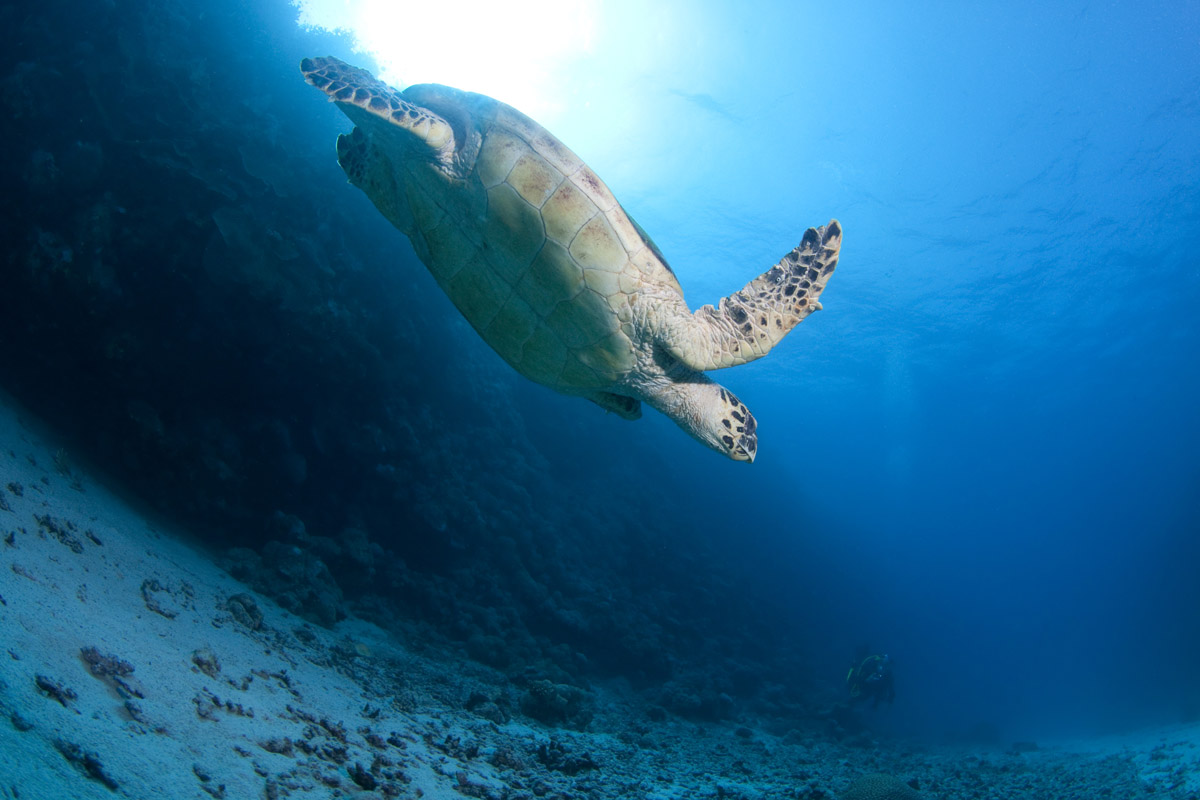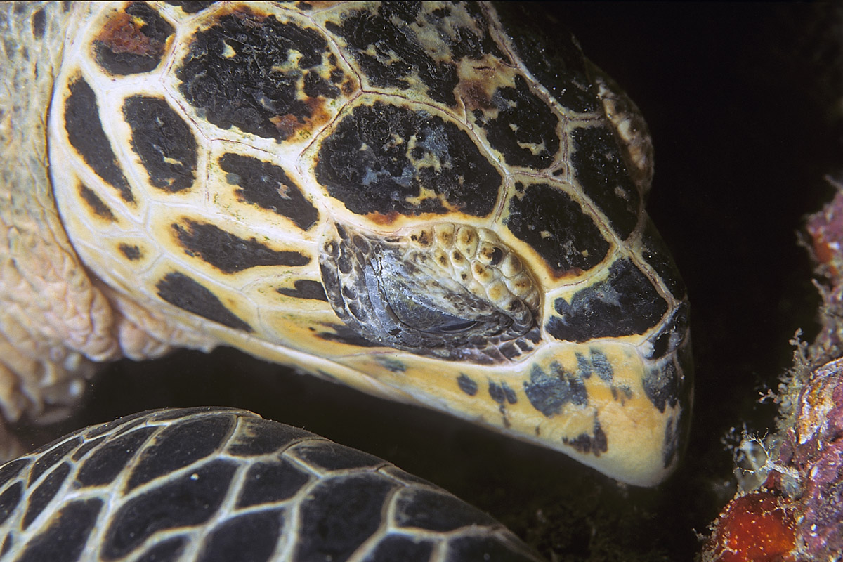 Sembra semplice fotografare correttamente una tartaruga ma dietro all'apparente facilità si nascono alcune piccole insidie fotografiche delle quali è bene tenere conto prima di scattare. La prima insidia riguarda le ombre che molto spesso si evidenziano in modo rilevante se il soggetto non viene illuminato correttamente, in particolare quando questo è appoggiato sulla barriera, quando si incontra infrattato all'interno di una grotta ma soprattutto per via della sua fisionomia decisamente particolare di cui parleremo più avanti.Sono molteplici le situazioni in cui possiamo incontrare la tartaruga visto che questo splendido animale potrà essere avvicinato mentre nuota nel blu così come appoggiato sulla barriera del reef oppure ancora nascosto dentro una grotta, dietro ad una gorgonia o appoggiato su un fondo di sabbia bianca. Molteplici situazioni che ci offriranno altrettanti spunti fotografici. E' proprio grazie a queste situazioni che sarà necessario approcciarsi nel modo migliore avendo ben chiaro il risultato che vogliamo ottenere. Innanzitutto l'avvicinamento all'animale non dovrà diventare motivo di disturbo e quindi dovrà essere effettuato con cautela. Come detto più volte se l'animale in quel momento non è socievole è inutile disturbarlo oltre il dovuto per il solo gusto di scattare una immagine al volo. Al contrario se la tartaruga sarà tranquilla potrete avvicinarvi con molta cautela cercando di non disturbarla oltre il dovuto, valutare la migliore inquadratura in funzione dell'ambiente circostante, della luce esterna e della posizione dell'animale. Troppe volte le immagini di tartarughe risultano poco dinamiche per via della sua forma un po' goffa. Se disponete di una macchina in custodia potrete utilizzare un obiettivo grandangolare in modo da contestualizzare l'animale all'interno di una situazione scenografica più ampia. Il flash come sempre dovrà servire soltanto come fonte di luce secondaria e quindi sfruttare la luce esterna o il controluce per poi illuminare dolcemente le zone più in ombra facendo attenzione a non creare forti macchie sul carapace dell'animale. Spesso le zampe che si protendono verso l'esterno se illuminate direttamente riflettono la loro ombra proprio sulla parte bassa del carapace. In sostanza il flash dovrà essere tenuto distante dal soggetto in modo che lo illumini nella sua totalità e la fonte di luce dovrà illuminare la zona in ombra.
