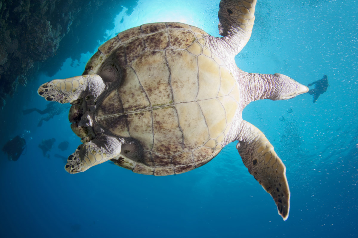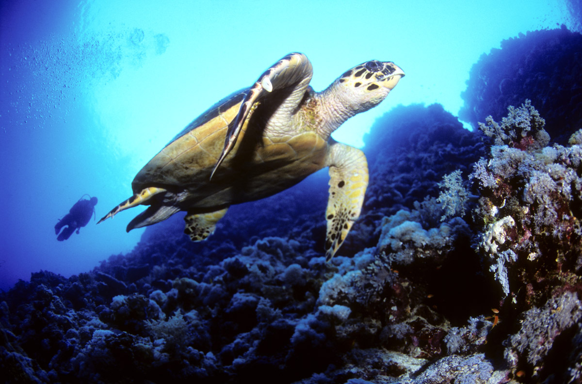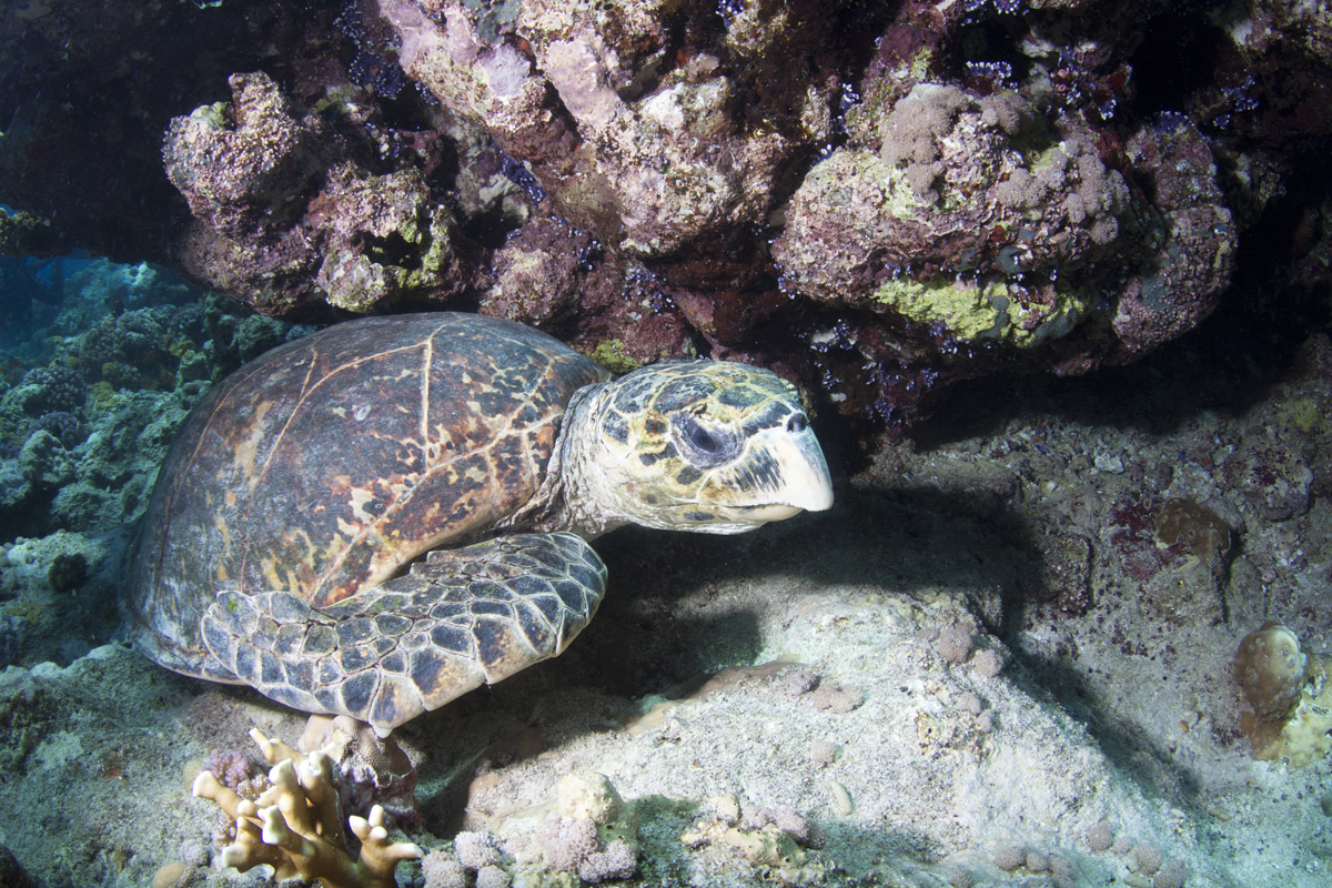 Delle varie tartarughe potenzialmente incontrabili in Mar Rosso, i maggiori incontri si hanno con Chelonia mydas, la tartaruga verde, che si nutre quasi esclusivamente di fanerogame (piante marine) e per questo, la si può incontrare facilmente su bassi fondali sabbiosi ricchi di praterie sommerse.Eretmochelys imbricata, conosciuta appunto come tartaruga embricata, ha un'alimentazione basata quasi esclusivamente su spugne, coralli molli e meduse e per questo possiamo trovarla sul pendio del reef.