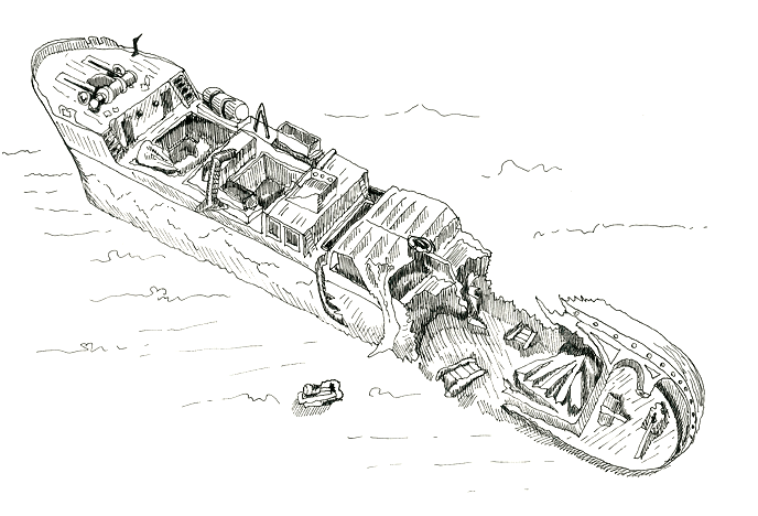 L’esplorazione completa della nave viene normalmente effettuata in più fasi, noi ci limiteremo a descrivere la nave nella sua totalità senza suddividerla per immersioni. Il relitto è orientato Nord Ovest – Sud Est. Partendo dalla zona poppiera, sul lato occidentale si osserverà la grande elica e la meravigliosa poppa dal basso. Pinneggiando lungo il lato sinistro, si salirà fino al ponte superiore dove si trovano la mitragliatrice pesante e il cannoncino antiaereo ormai ricoperti da alcionacei; ben visibili sulla coperta a -25 metri di profondità, l’ampio squarcio aperto dalle bombe tedesche in corrispondenza della quarta stiva che conteneva munizioni, bombe, i due carri armati e una locomotiva che dopo l’esplosione è stata catapultata a una distanza di circa -30 metri dalla nave ad una profondità di -28 metri. Si risale lungo il ponte, spesso contrastati da una corrente contraria diretta a sud-est, ci si dirige verso la prua dove a -15 metri si potrà osservare il grande salpa-ancore. L’ancora di sinistra è ancora appesa mentre la catena di dritta scende verticale sul fondo a -31 metri di profondità per poi snodarsi in direzione nord fino all’ancora distante una sessantina di metri. Le altre immersioni saranno invece riservate all’esplorazione delle strutture interne della nave, delle tre stive e del loro carico. La prima stiva situata a prua è la più interessante: nella sua parte più profonda contiene casse di medicinali, fucili Lee Enfield MK III, stivali di gomma e pneumatici, mentre nel livello superiore si trovano le motociclette BSA e alcuni modelli di automobili Morris. La seconda stiva posta in posizione mediana, il cui ingresso è fiancheggiato da due vagoni ferroviari, è suddivisa come la precedente in due livelli: in quello inferiore si trovano i camion Bedford mentre nel superiore vi sono altre motociclette BSA e automobili Morris. Immediatamente a poppavia della seconda stiva si trova la plancia parzialmente scoperchiata da cui si può accedere alla cabina di comando. Procedendo verso poppa si giunge alla terza stiva nella quale si trovano per lo più casse di munizioni e bombe a mano: al di là si nota il foro del fumaiolo a poppavia del quale vi è lo squarcio corrispondente alla quarta stiva con i due cingolati MK II Bren Carrier. Durante questa immersione si avrà la possibilità di osservare anche la ricca fauna che lo popola: dai banchi di platax ai barracuda, dalle grosse cernie ai banchi di carangidi e lutianidi. E’ fondamentale seguire nel corso delle immersioni alcune regole di sicurezza. Innanzitutto la discesa e la risalita vanno effettuate tenendosi saldamente alla cima d’ormeggio della vostra imbarcazione poiché le correnti presenti che battono questo tratto di mare sono spesso intense e mutevoli e può accadere che in superficie la corrente sia di direzione opposta a quella in profondità. Un altro aspetto da non sottovalutare è l’aria, trattandosi di un’immersione al limite della curva di sicurezza. Purtroppo oggi il gran numero di subacquei che giornalmente s’immergono sulla nave, ha raggiunto livelli insopportabili per la conservazione delle sue strutture e le bolle d’aria emesse che si accumulano contro le pareti della nave, creano rapide corrosioni che ne mettono in serio pericolo la sua sopravivenza.