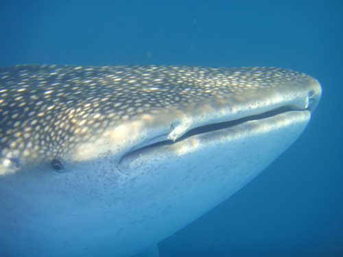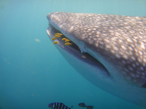 Ad un certo punto, l'immedesimazione è tale che anch'io, pensando forse di essere uno squalo balena, ingoio almeno due litri d'acqua. Ma l'incontro è spettacolare e non riesco a pensare ad altro, se non ad immortalare il momento in cui la sua bocca si apre a tal punto da inghiottirmi. Il sole cala e dobbiamo salutare i pescioni.