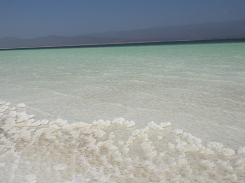 Il lago Assal spunta come un miraggio tra le gole montuose che attraversiamo. E' una macchia bianca che si allarga fino a diventare immensa ed a coprire il mare. Eccolo davanti a noi, questo enorme lago salato incastrato in una depressione posta a 153 metri sotto il livello del mare. La vista è accecante ma ci ripaga della fatica e del caldo patiti nel pulmino per arrivare fin qui. Quando si cammina su questa sconfinata distesa immacolata, sembra di fluttuare in una dimensione onirica che ci fa sentire piccoli piccoli.