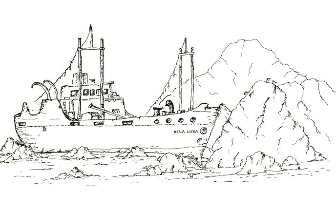Il relitto è posizionato in perfetto assetto di navigazione con la prua a -25 metri e il timone con la grossa elica a 5 pale a -25 metri di profondità. Iniziando l’immersione dalla zona di prua si noterà subito come il violento impatto contro la parete del reef abbia sensibilmente segnato la prua. Subito a ridosso della prua si incontra un primo grosso argano e poco oltre il bigo di carico, successivamente la prima stiva e poi la seconda stiva, tutte e due totalmente vuote all’interno. La visita agli interni delle stive è assolutamente sconsigliata in quanto oltre a non essere di nessun interesse, vi è una sospensione talmente fitta da non permettere di proseguire oltre. Nel caso in cui si decidesse di addentrarsi, bisognerà fare molta attenzione alle lamiere che pendono dal soffitto che possono essere molto pericolose. Tra le due stive si trova una grossa gru idraulica di carico. Dopo avere oltrepassato il secondo bigo, si raggiungerà il castello di comando posto nella zona posteriore della nave e situato in posizione più elevata rispetto al ponte principale. L’accesso alla cabina di comando potrà avvenire attraverso uno dei due portellone posti ai lati, facendo molta attenzione a non sollevare la finissima sedimentazione presente per terra, si trovano ancora il telefono di bordo e il telegrafo di macchina perfettamente intatti, mentre subito dietro c’è la piccola cabina del comandante con la sala carteggio e quel che resta del mobile porta bandiere. Di fianco alla cabina di comando c’è un secondo portellone che conduce direttamente alla sala macchine, anche qui l’accesso è molto stretto e particolarmente difficoltoso. Lasciata la zona del castello di comando e sala macchine si raggiunge la zona poppiera superiore, leggermente sollevata rispetto al terrazzo di poppa. Ai lati vi sono 2 osteriggi per l’entrata in sala macchine. Osservando la nave dal mare aperto vedremo una poppa molto ampia e arrotondata sulla quale compare a grandi caratteri il nome Vela Luka Dubrovnik.