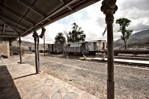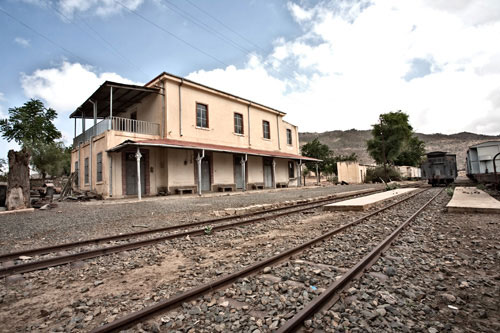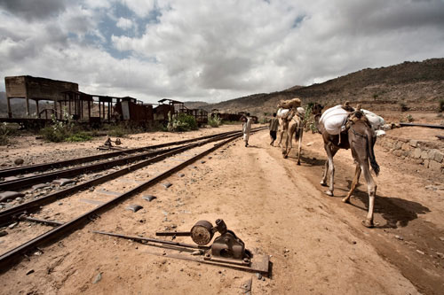 Passeggio per Asmara e vengo lentamente assorbito da una sensazione unica che mi porta a diventare parte di questo mondo come se non lo avessi mai abbandonato, come se non fosse trascorso tutto questo tempo dal giorno in cui l'avevo lasciata definitivamente e quasi rimossa dalla mente senza grandi rimpianti. Attimo dopo attimo, giorno dopo giorno mi ritrovo inconsapevolmente a fare parte di questa comunità di italiani d'Eritrea che hanno il privilegio di vivere in questo luogo speciale e la sfortuna di essere invisibili agli occhi del paese di cui sono cittadini. Ma questo viaggio fin dall'inizio aveva un tema ben preciso legato al treno anzi alla ferrovia costruita dagli italiani all'inizio del secolo scorso, per la precisione si festeggiavano proprio i 100 anni dalla sua costruzione. Avevamo poche informazioni sullo stato attuale della ferrovia ma nonostante tutto, l'argomento era affascinante e comunque eravamo certi che in un modo o nell'altro ne saremmo venuti a capo, che avremmo portato a casa un buon lavoro. PROLOGO il viaggio lungo la strada ferrata Abbiamo sempre viaggiato seguendo quelle rotaie che a volte sono state una presenza concreta mentre in altre occasioni un compagno immaginario come lungo il tratto che collegava Asmara a Keren di cui oggi esiste solo il loro ricordo. Abbiamo cercato le vecchie stazioni senza conoscere nulla di loro ed è stato proprio questo uno degli aspetti più emozionanti del viaggio. Cercarle e trovarle, emozionarsi di fronte alla loro presenza ed immaginare cosa ci avrebbe atteso alla fermata successiva. Entrare in un paese seguendo le rotaie del treno e finalmente imbattersi nella sua stazione. Seguire le rotaie di un treno che in molti punti esiste più nell'immaginazione che nella realtà e rendersi conto di come ancora oggi queste rotaie siano la direttrice per uomini, bambini e animali. Siamo partiti in treno da Asmara e abbiamo terminato il nostro viaggio attraverso le stazioni scortati da lunghe carovane di cammelli che si muovevano seguendo le rotaie, abbiamo osservato gruppi di bambini giocare lungo le rotaie, abbiamo incontrato pastori transumanti condurre le loro mandrie lungo le rotaie, ci siamo imbattuti in popolazioni appartenenti a diverse etnie darsi appuntamento sulle rotaie e poi, in ogni stazione dove ci siamo fermati abbiamo incontrato file interminabili di vagoni adagiati su quelle rotaie appartenenti ad epoche lontane. Ogni stazione è stata un colpo al cuore, una emozione indescrivibile. Nei tempi in cui il treno era in attività partiva da Massaua sulle coste del Mar Rosso per raggiungere Asmara a 2300 metri di altitudine, facendo tappa a MaiaTal, Ghinga, Nefasit, Arbaroba e finalmente Asmara. Il treno proseguiva poi da Asmara verso nord ovest fino a Keren e Agordat.